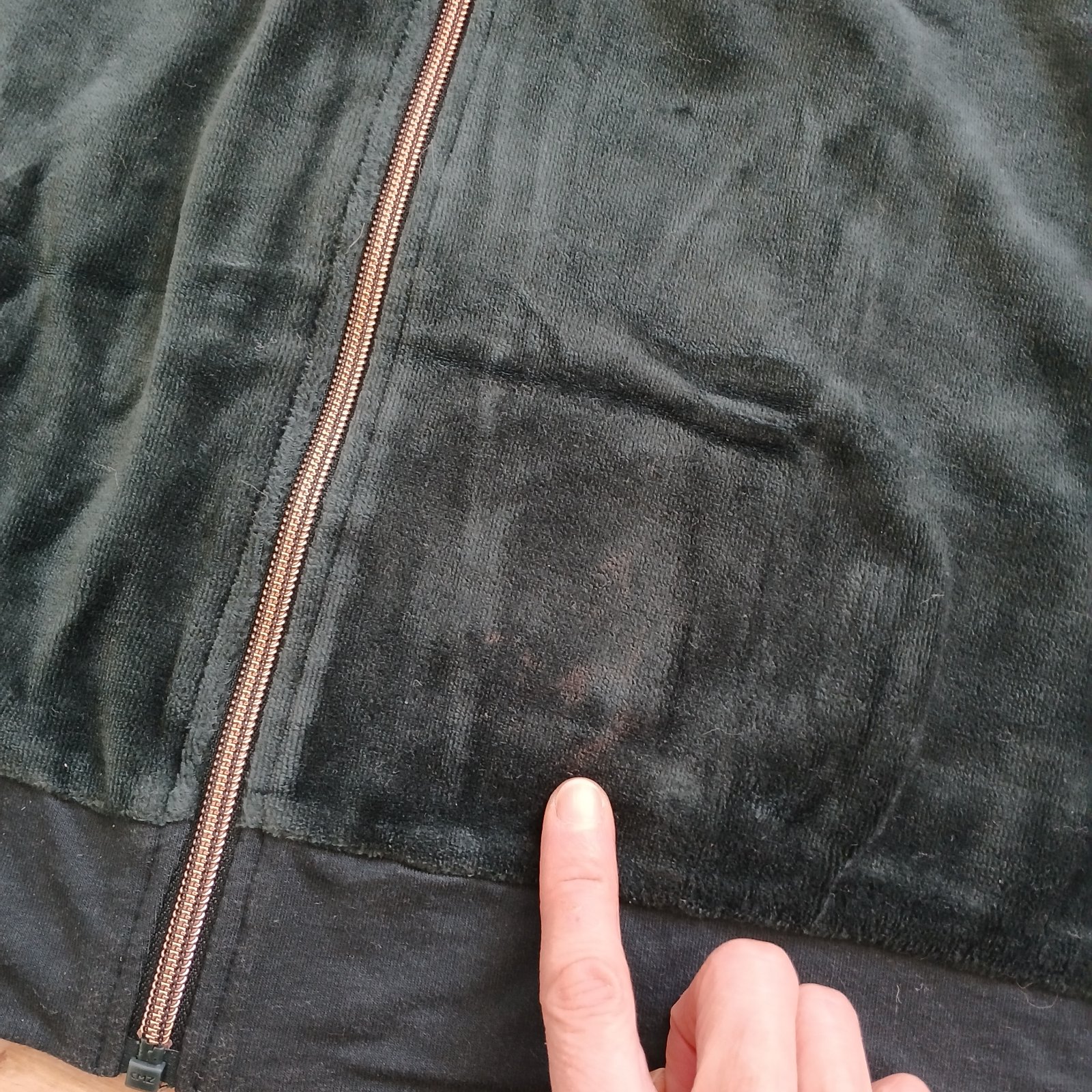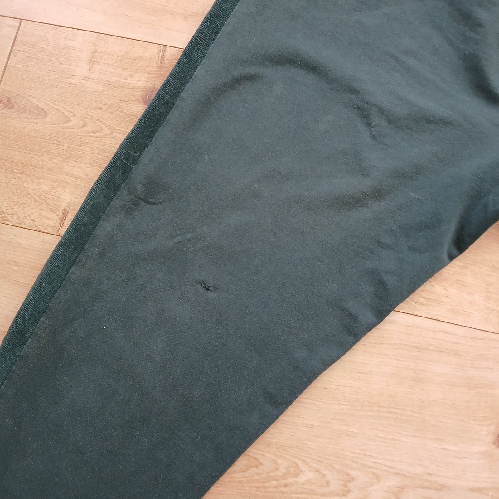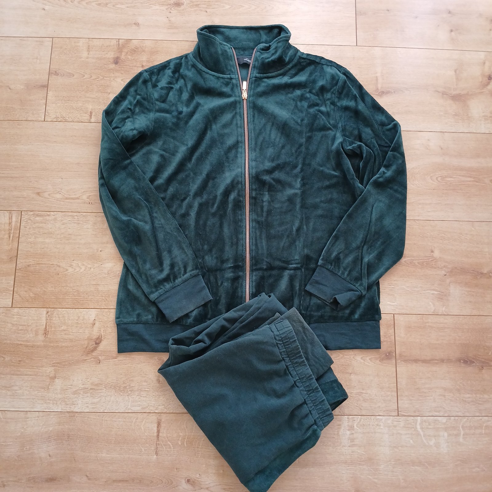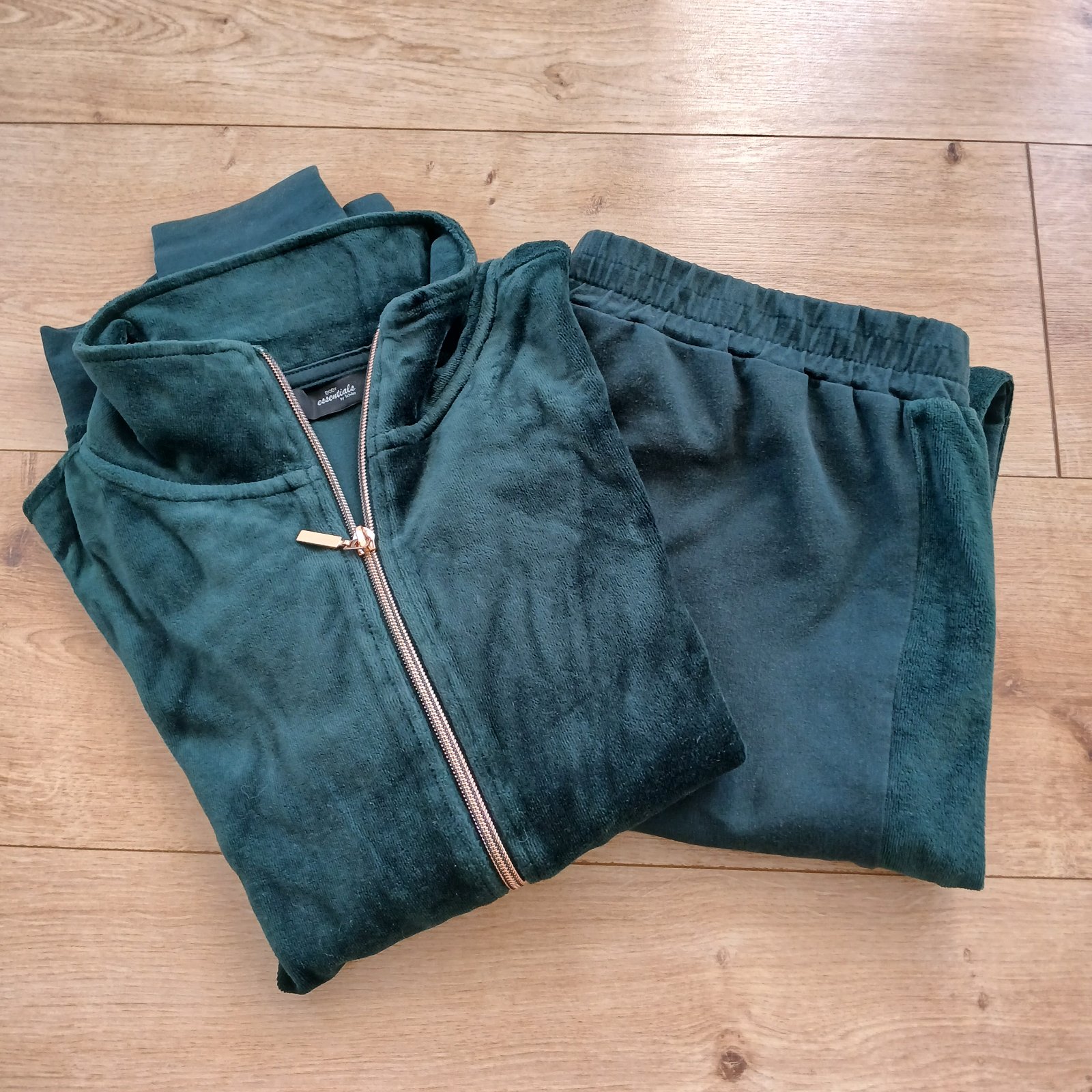 Tmavozelená farba, mikina je niečo ako zamat a tepláky klasická stredne hrubá bavlna, po bokoch majú zamatový pás