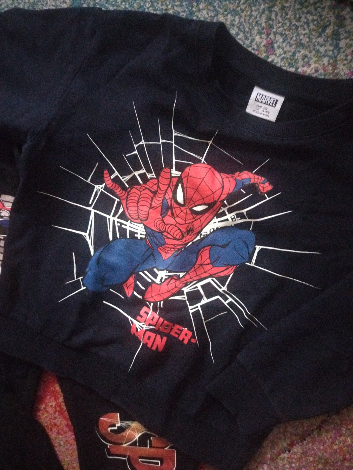 Tepláky Marvel nosené 116, Trošku sa odliepa aplikácia s obrázkom Spidermana.
