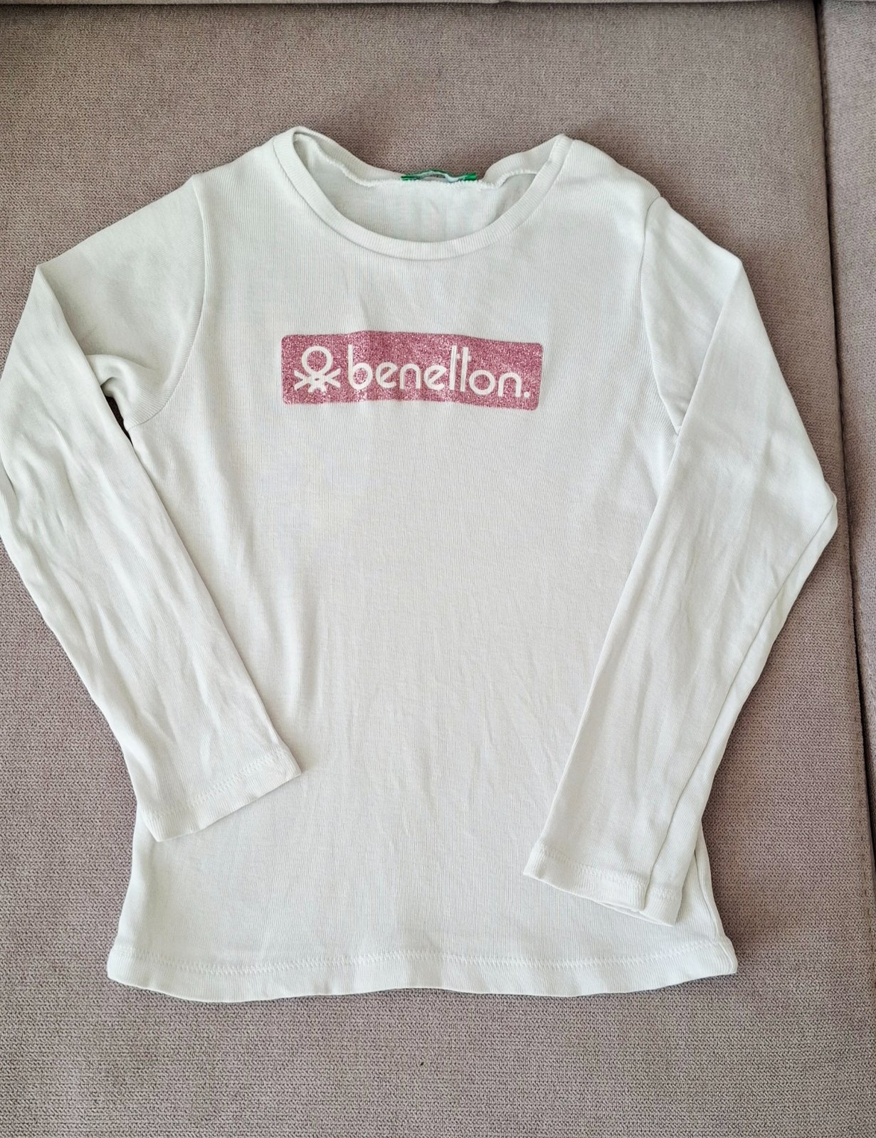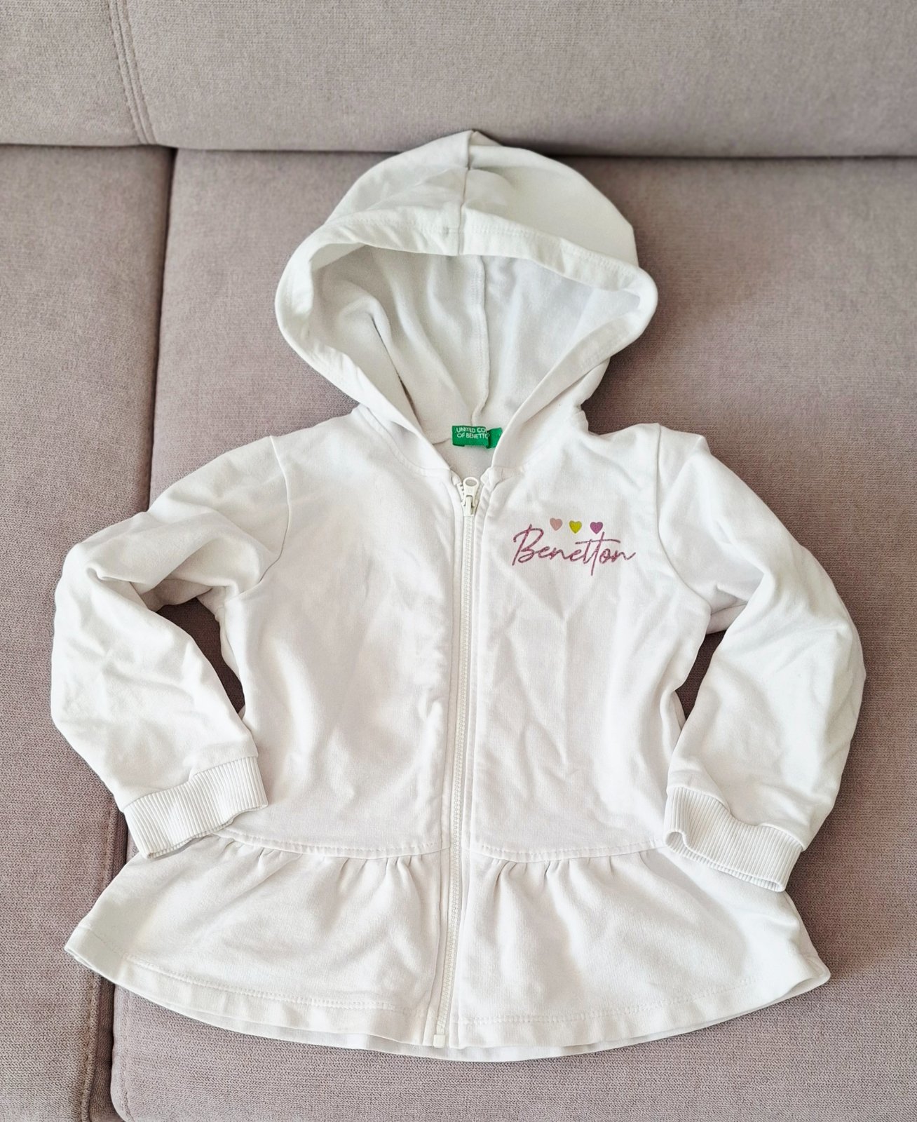 Biely set Benetton. Trucko 98, ale je vacsie skor 104, mikina 110. Dcera to nosila spolu. Je to rovnake dlzkou.