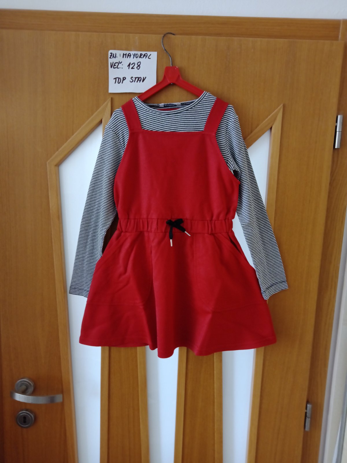 Predám dievčensku súpravu (šaty a tričko s dlhým rukávom) zn.Mayoral veľ.128,v top stave.Latka na šatách je lesklá.Da sa nosiť aj v lete s tričkom s krátkym rukávom.Cena je 13eur.