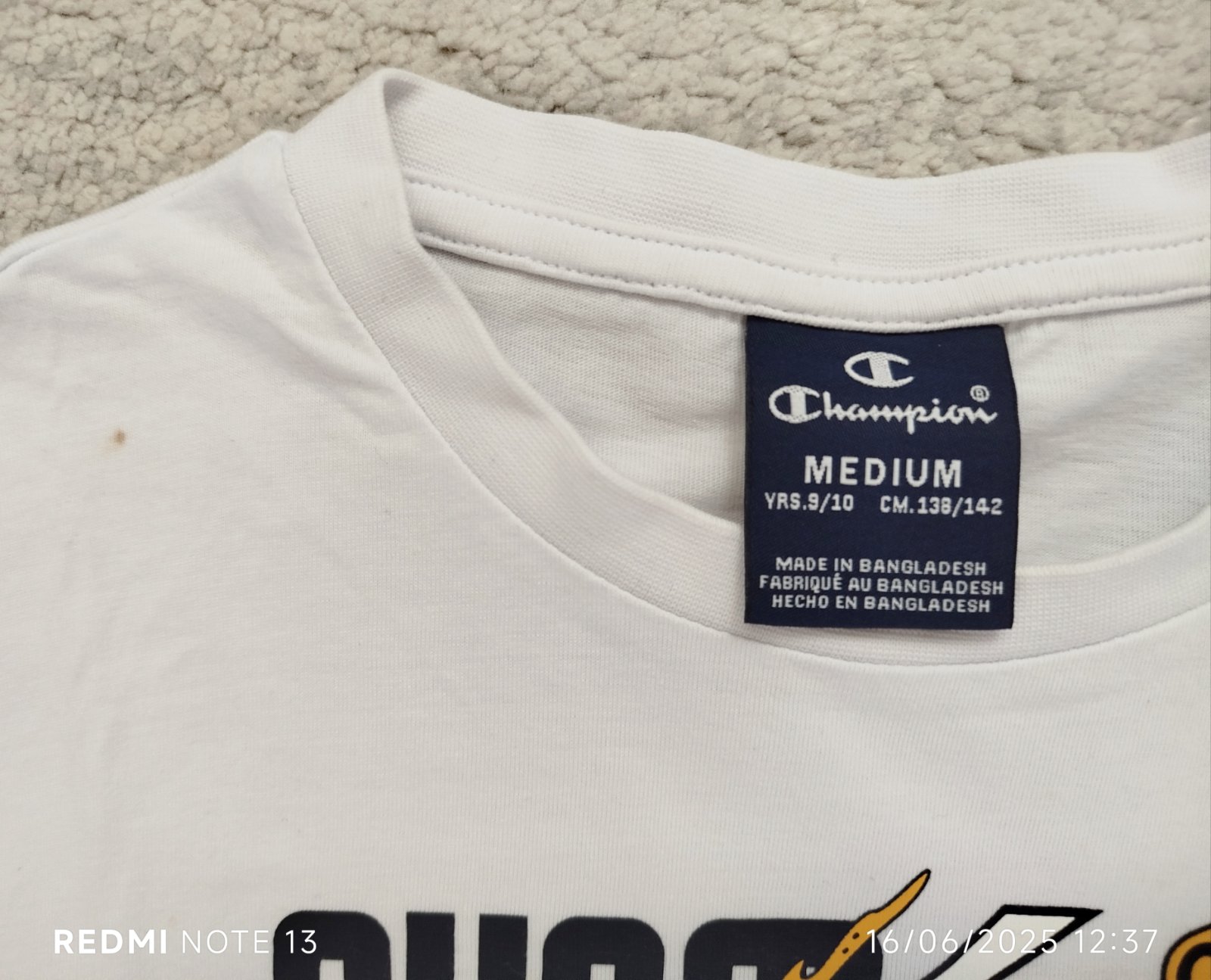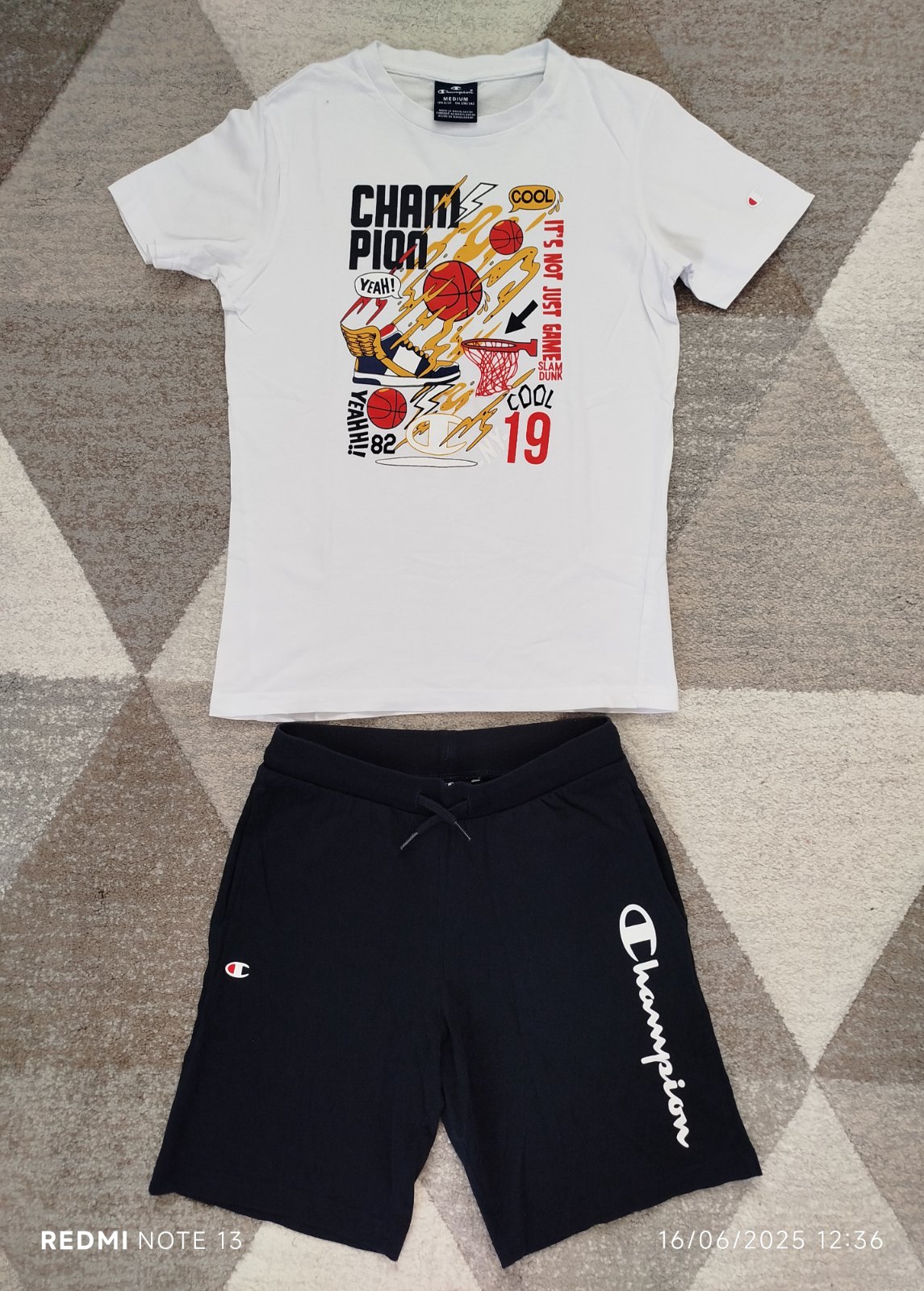 Športový komplet / súprava Champion, veľkosť 140. Pekný nosený stav bez poškodení, na tričku je jedna bodka pri výstrihu (viď foto) inak je v poriadku, cenu prispôsobujem. Tričko dĺžka 55cm, prsia v kľude 38cm. Kraťasy dĺžka 40cm, pás v kľude 30cm, natiahne sa do 35cm alebo sa dá stiahnuť šnúrkou. Súprava je vhodná pre chlapca i dievča. Cena + pošta do 500gr. Balné si neúčtujem 🙂