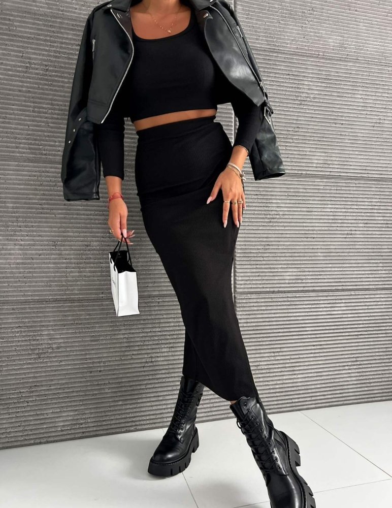 Čierny komplet Gilian pozostáva zo sukne a topu. Top má strih crop topu a sukňa má vysoký rozparok. Pomôže vám vykúzliť štýlové denné mestské outfity.