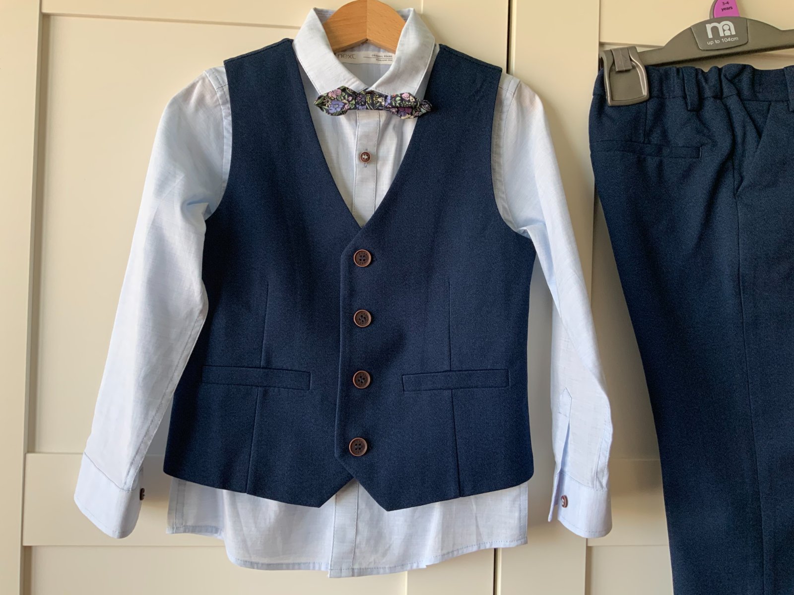 Predám tmavomodrý slávnostný 4-dielny set, zn. NEXT. Veľkosť 110. Kupovaný na svadbu, na ktorej sme nakoniec neboli. Samozrejme sme ho hneď vyrástli. Nenosený.