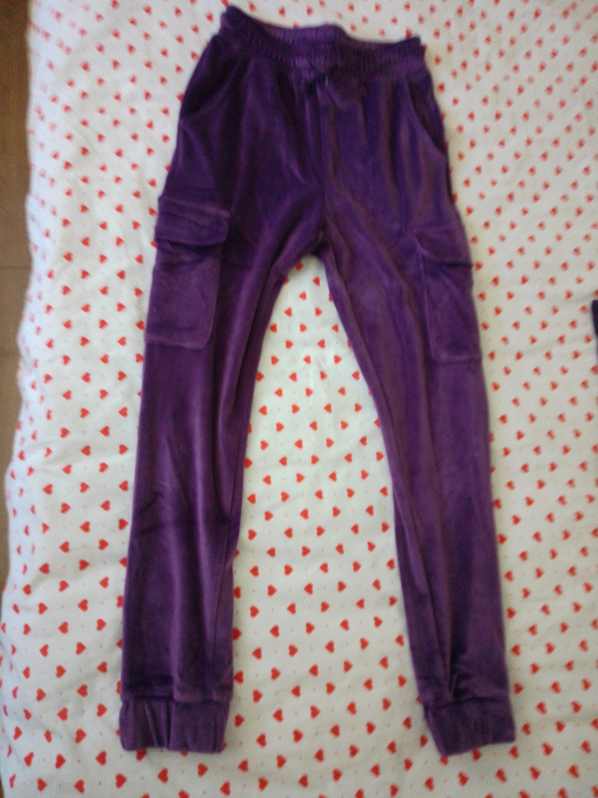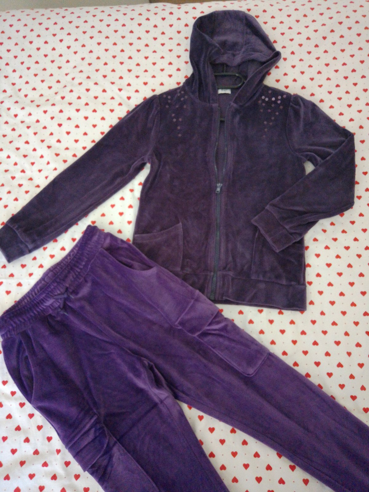 Plyšový materiál vrch aj spodok, tepláky sú ako nové, iba vrch je tmavší a tepláky bledšie fialové,tie sú iná značka.