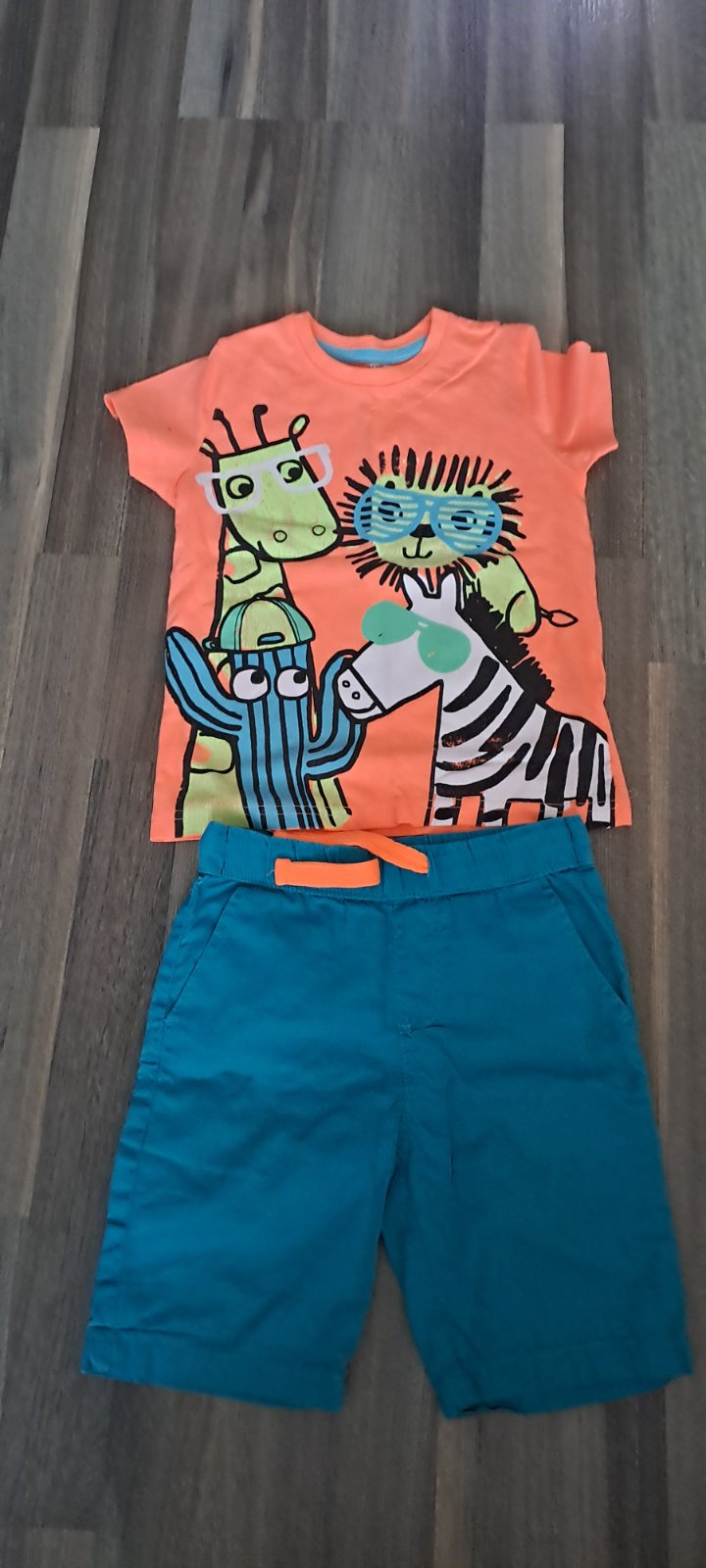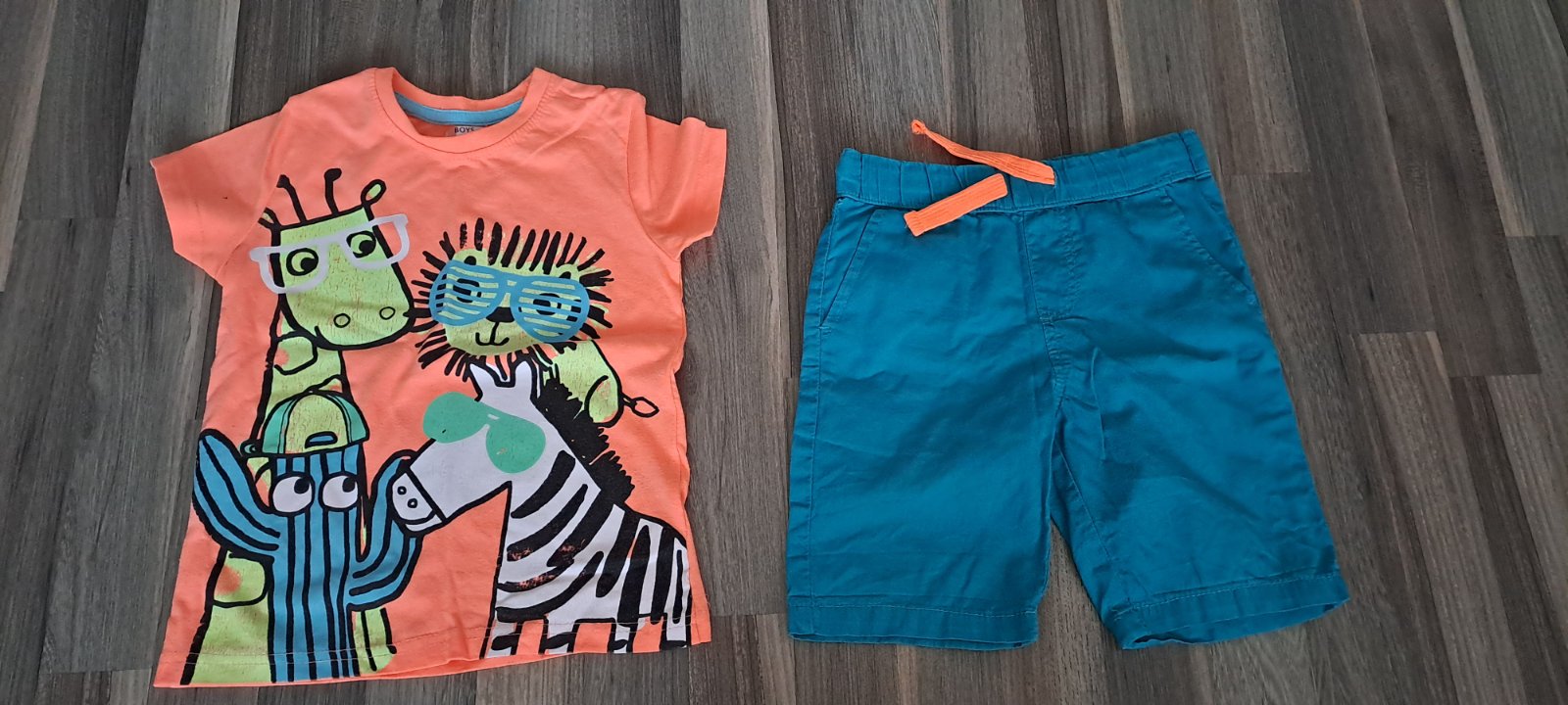Ponúkam na predaj bavlnené šortky/kraťasy, príjemný materiál, značka PALOMINO, veľkosť 104 (3-4 roky). Ku kraťasom pribalím aj krásne žiarivé tričko (oranžovej farby s potlačou zebry, levíka, žirafy a kaktusu). Bez poškodení. Cena 3€/set.