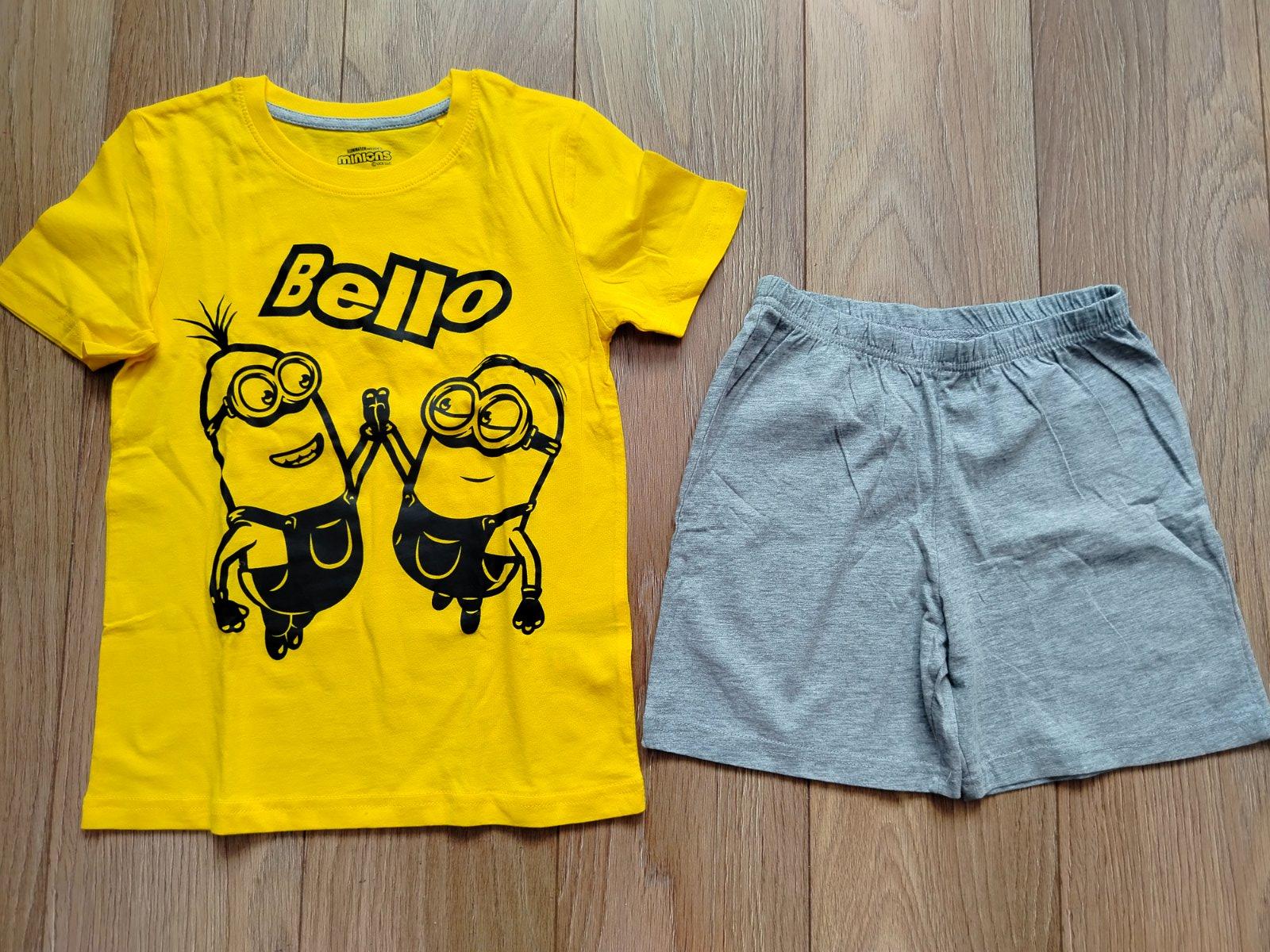 Predám peknú detskú súpravu Minions – žlté tričko s veľkou potlačou dvoch Mimoňov (jeden robí „šťastný“, druhý „nahnevaný“) a nápisom „Bebo“ + šedé kraťasy s malou potlačou Mimoňov na nohavičke.