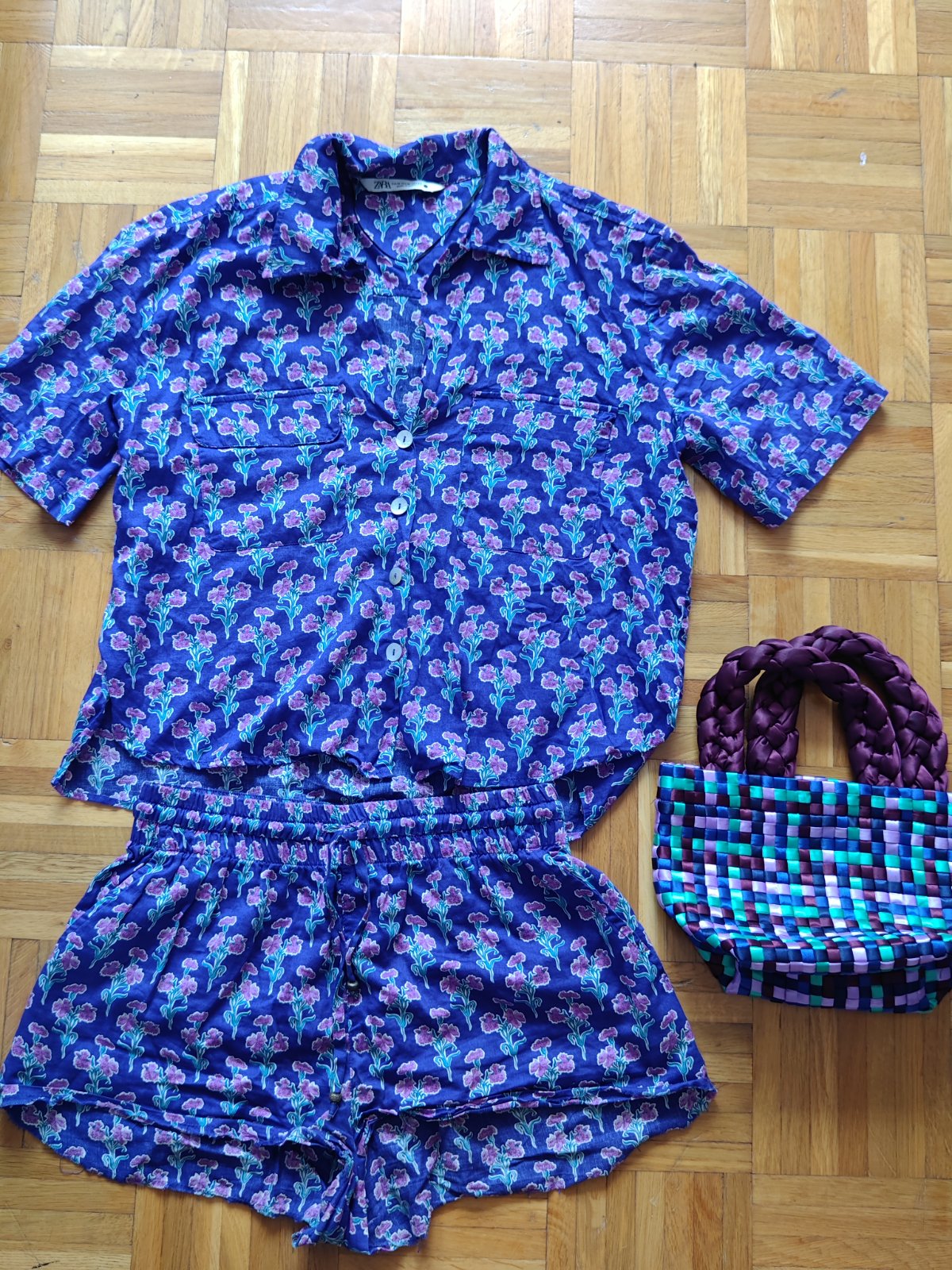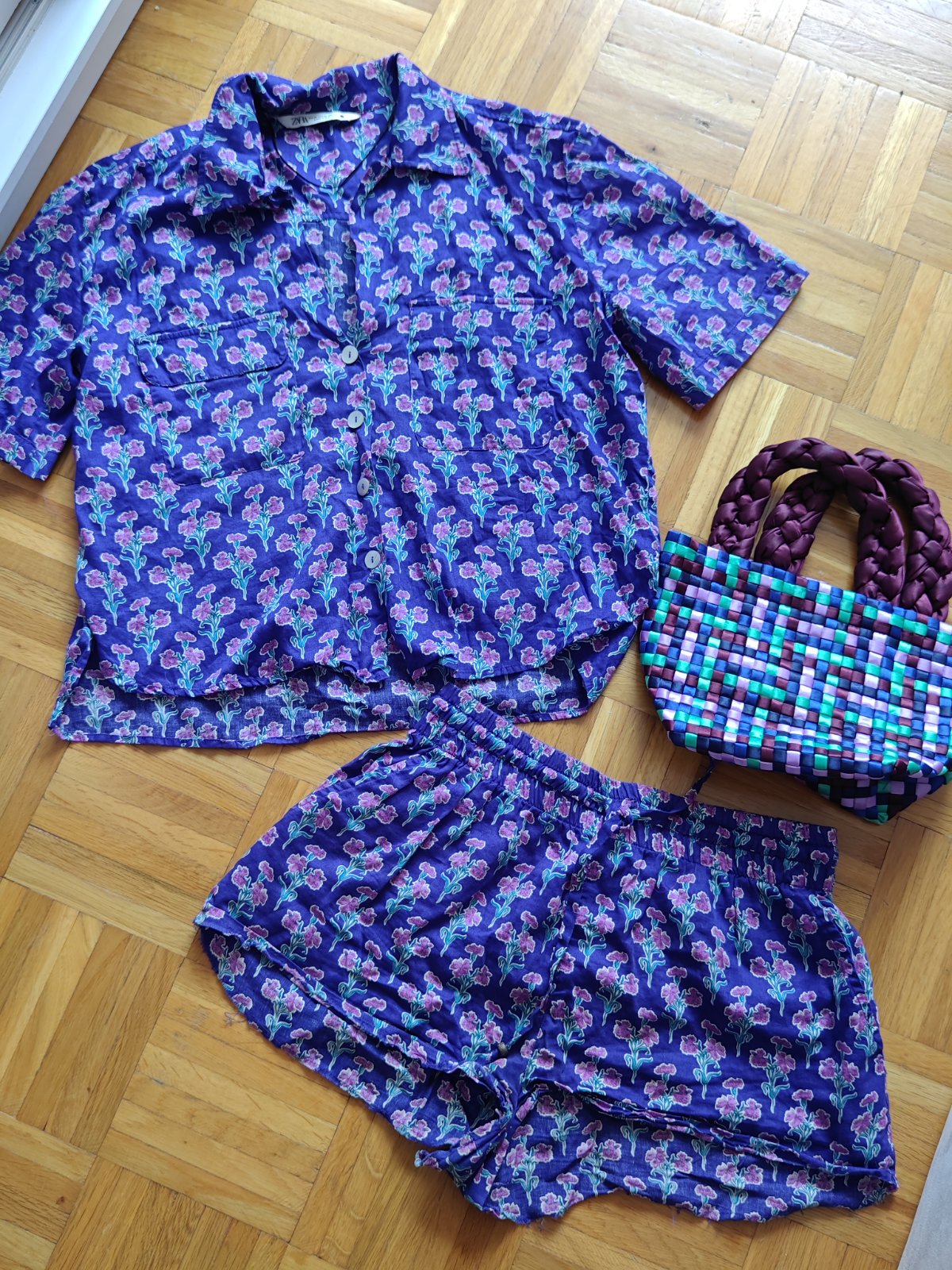 Nádherný hebúnky kvalitný vzdušný kompletík Zara, bluzká a kraťasy a k tomu super ladiaca luxusná kabelka Zara, veľkosť m-ko aj menšie L