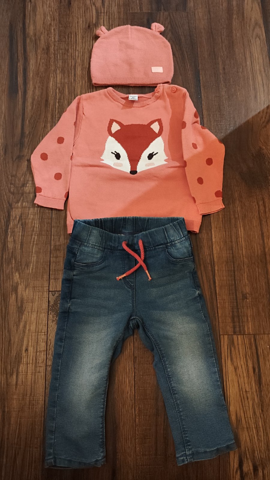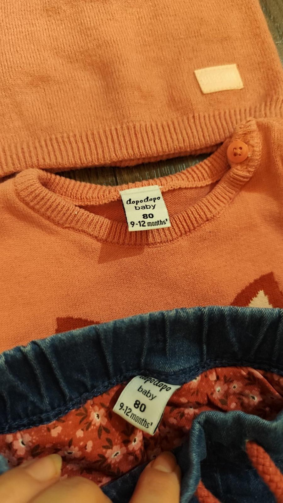 Komplet pozostávajúci z riflí, pulóvra a mäkkučkej čiapky značky Dopodopo, veľkosť 80 (ale sadne aj na väčšie číslo)... Stav ako nový (nohavice nebolí vôbec oblečené). Vyprané v Non toxic prášku. Cena za komplet.