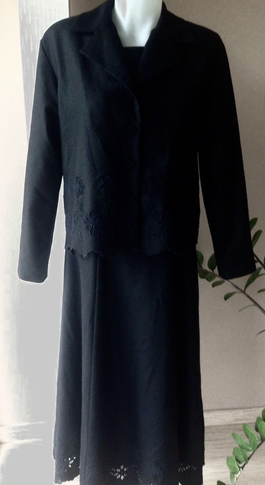 Krasny komplet pozostávajúci zo šiat a kabátika,farba je sýtočierna,šatky sú akoby s prímesou vlny,hrubšie,ale nie ako kabat zas,dole okolo spodku siat aj saka dierkovany nadherny vzor,šaty sú podsité,zapínajú sa vzadu na zips a zavázuju tenkym opaskom