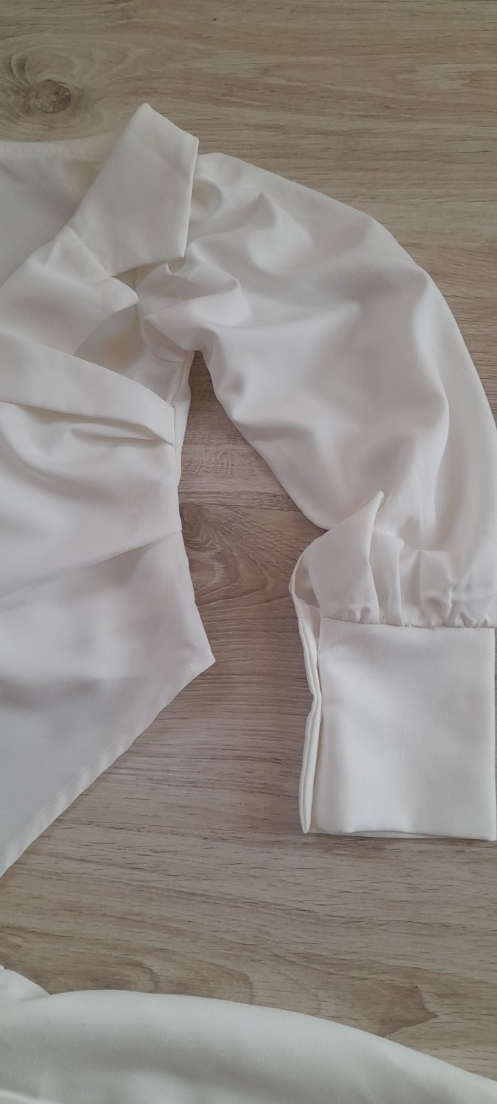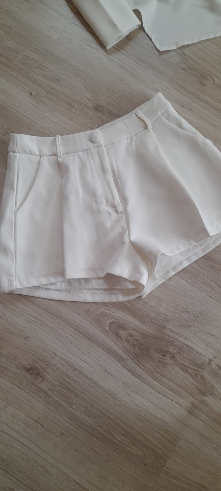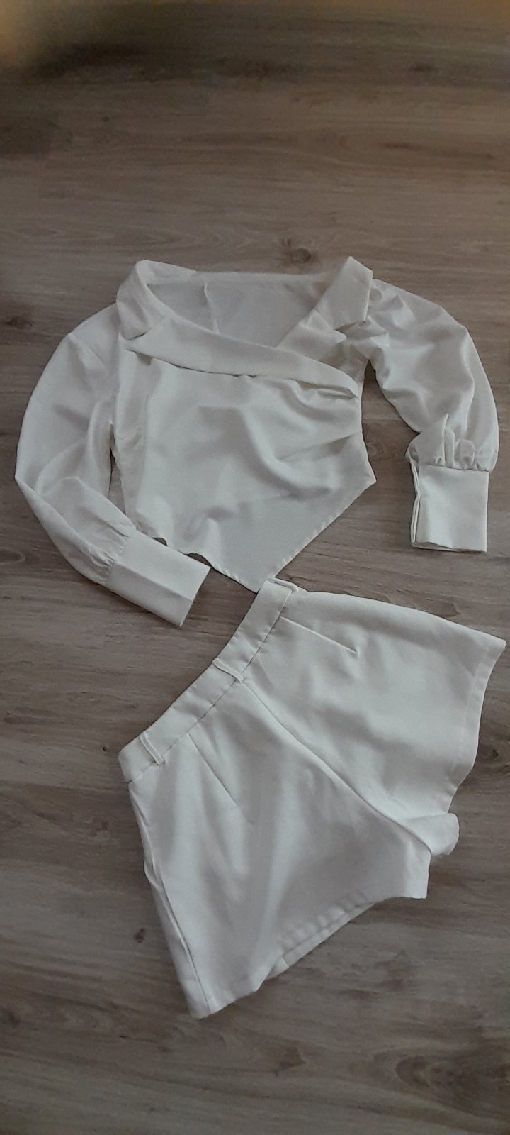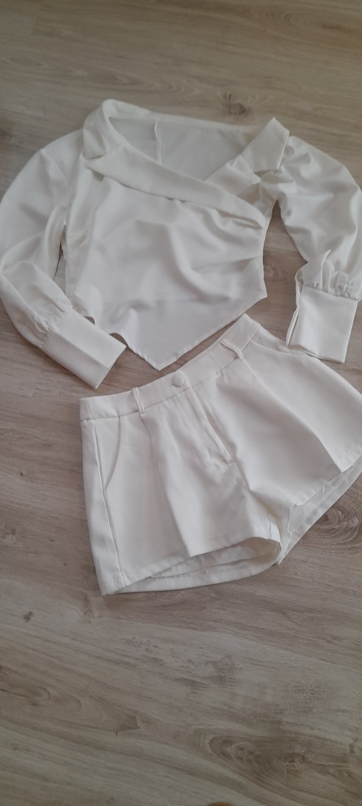 Nové! Bez visačky, košelový asymetrický crop top, jedno plece odhalené, puff rukávy, vpredu do špicu. Preklad v oblasti drieku robí super postavu, veľkosť S. Kraťasy s pukmi veľkosť M. Komplet sedí na S, M.