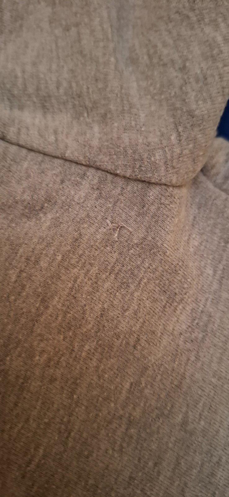 Nosený stav, chlp z prania. Na nohaviciach zašita dierka.