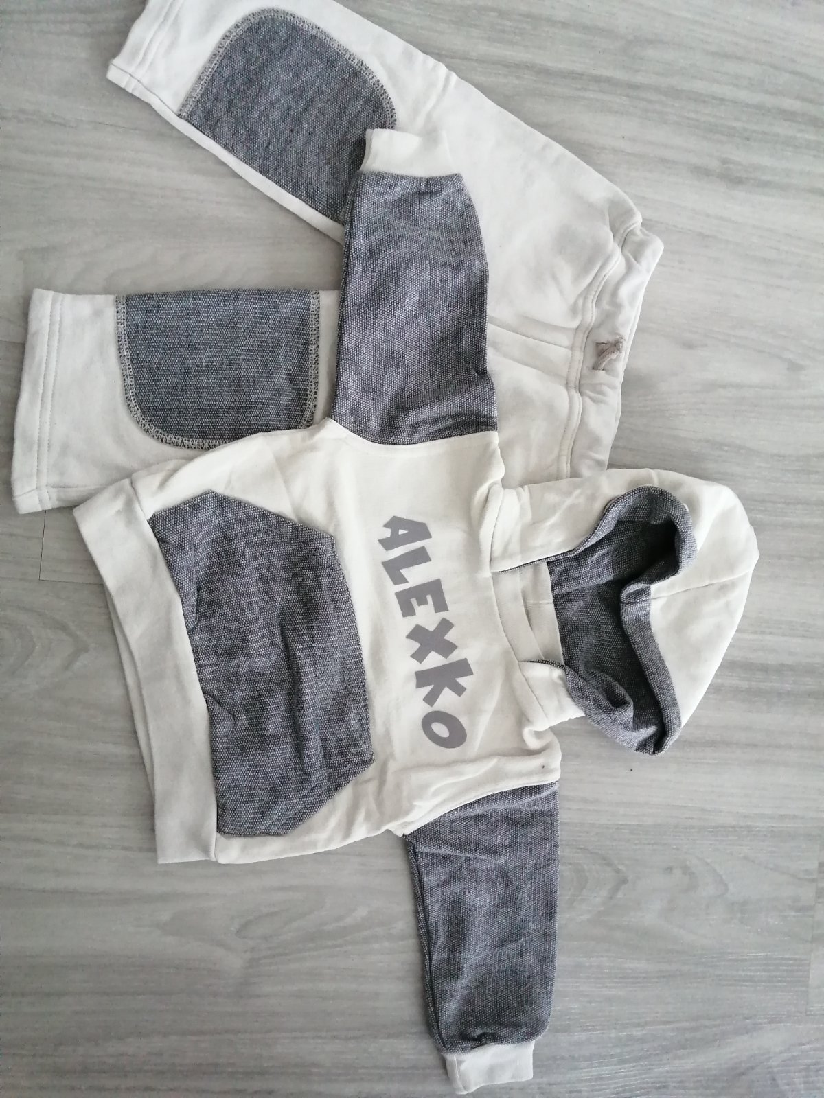 Krémová suprava v top stave a modrá mikina veľkosti 86.