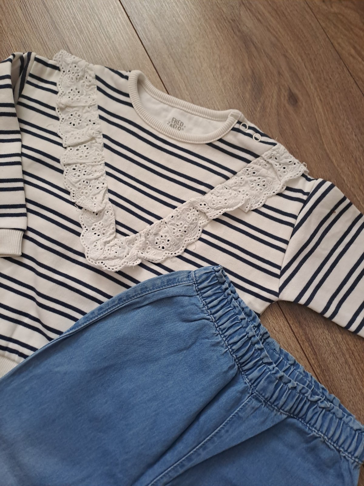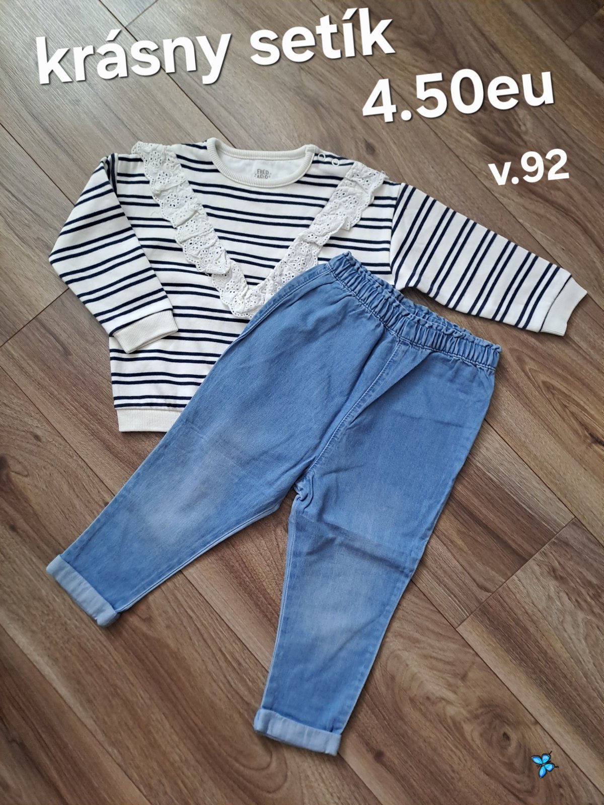 Nádherne tričko s motívom zajačice, druhé tričko dievčatko s mackom, trblietavé kamienky, na oboch, výborný materiál. K tomu nádherné kvietkove leginky kombinovatelne k obom tričkám. Veľkosť 18-24m...