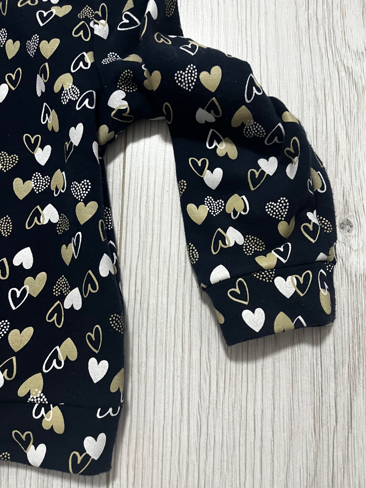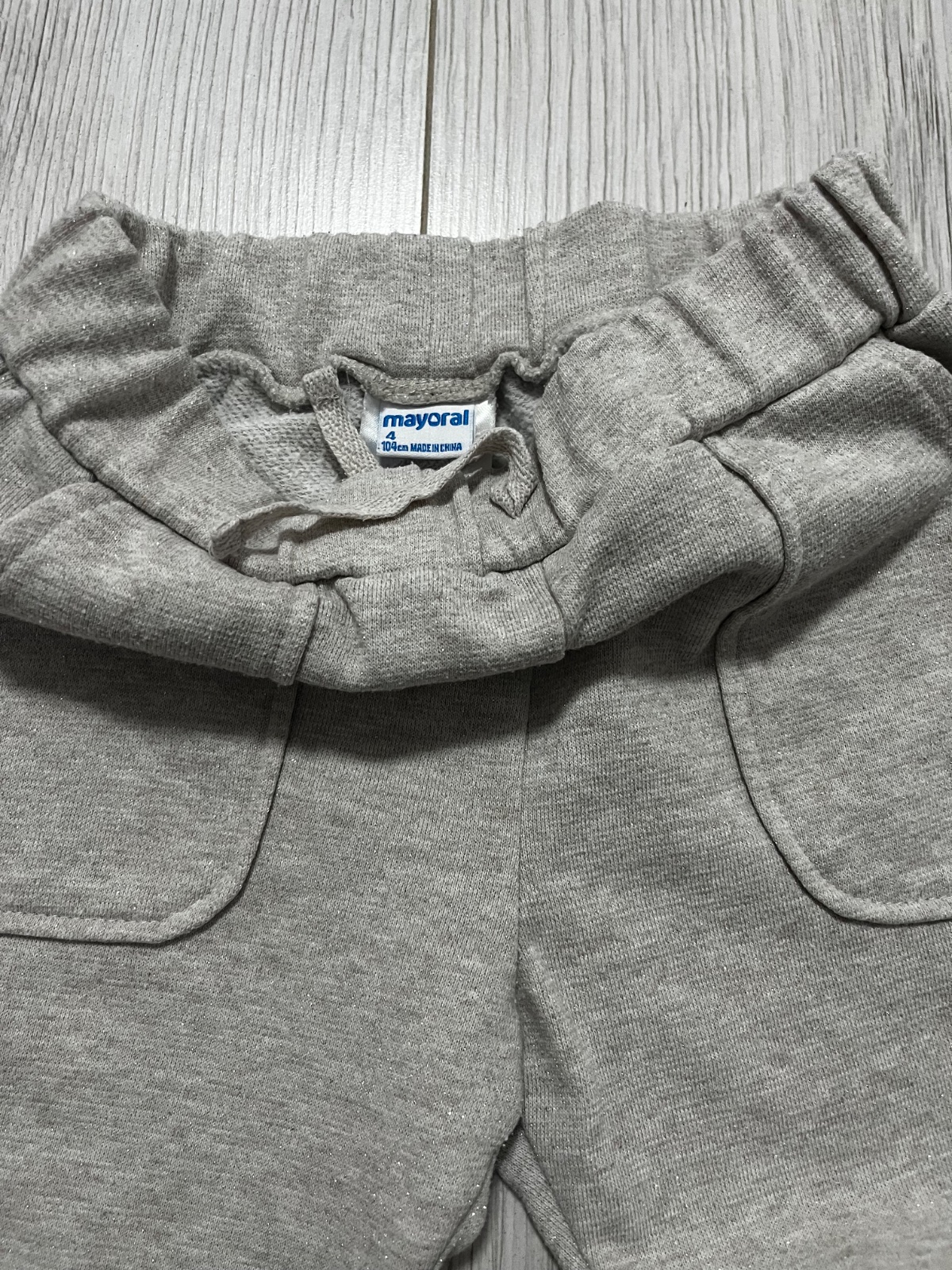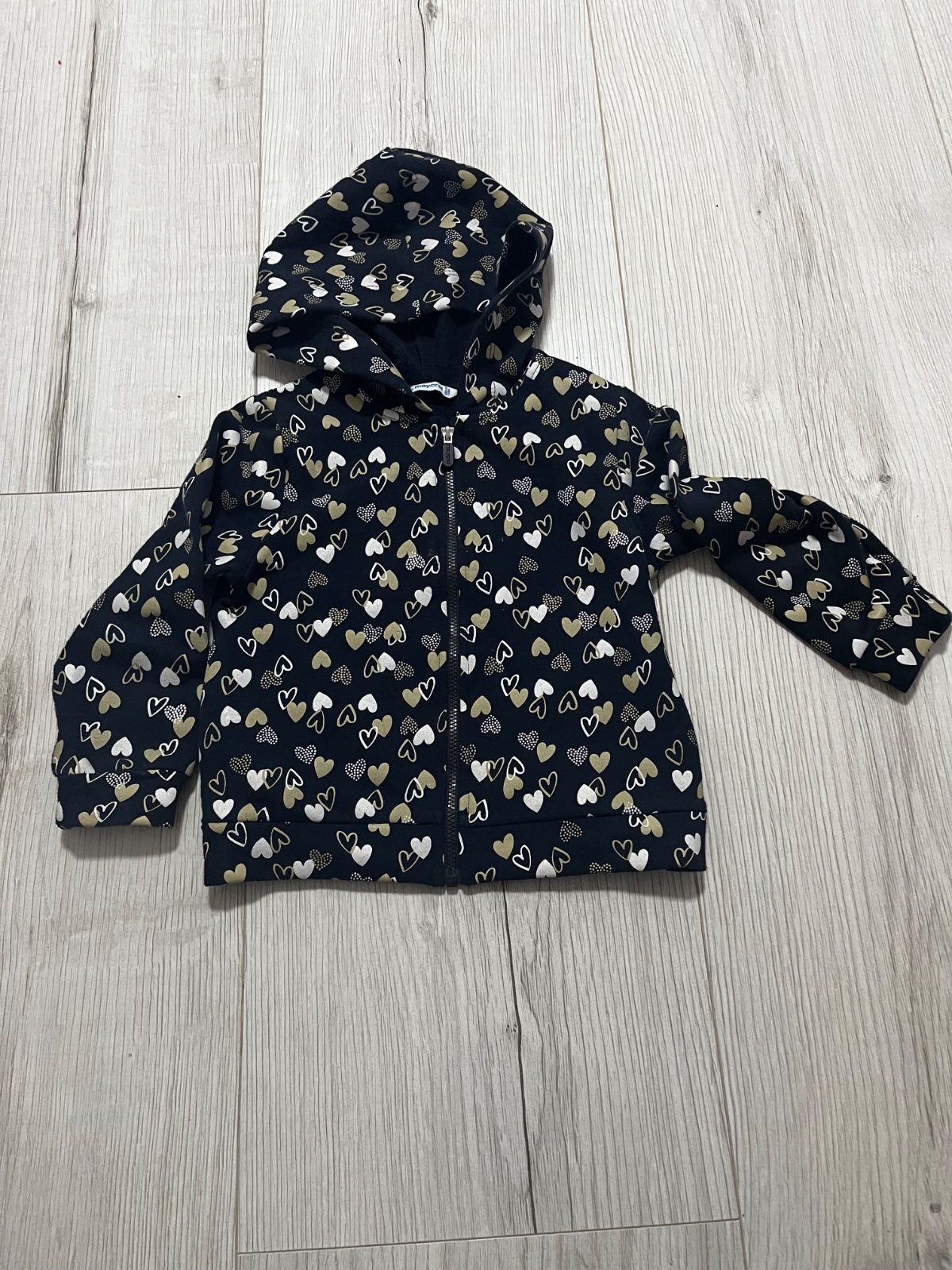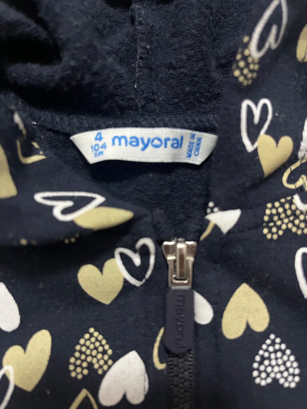 Predám teplákovú súpravu vhodnú aj do škôlky značky Mayoral, veľkosť: 104. Mikina s kapucňou sa zapína na zips a je tmavomodrej farby s bielymi a béžovými srdiečkami. Tepláky majú vpredu vrecká a du béžovej farby s trblietkami. Tepláky sú trošičku vyzmolkovane.