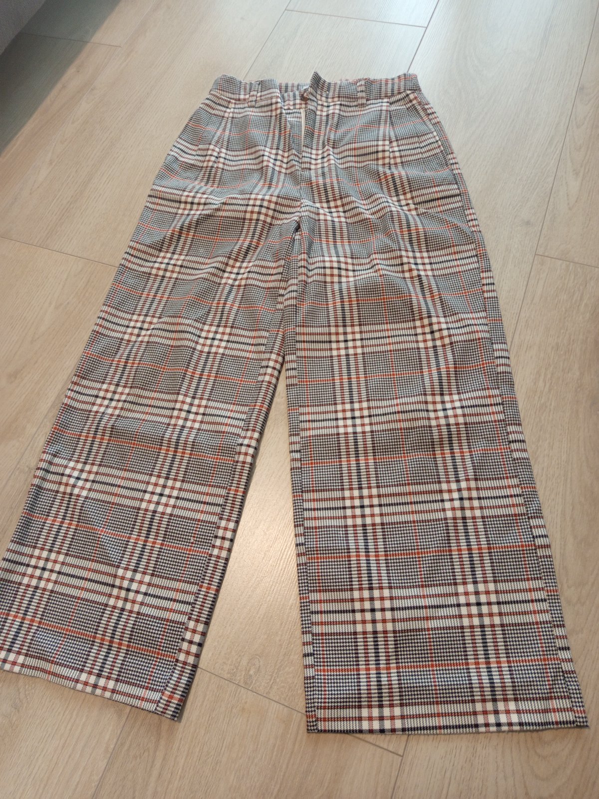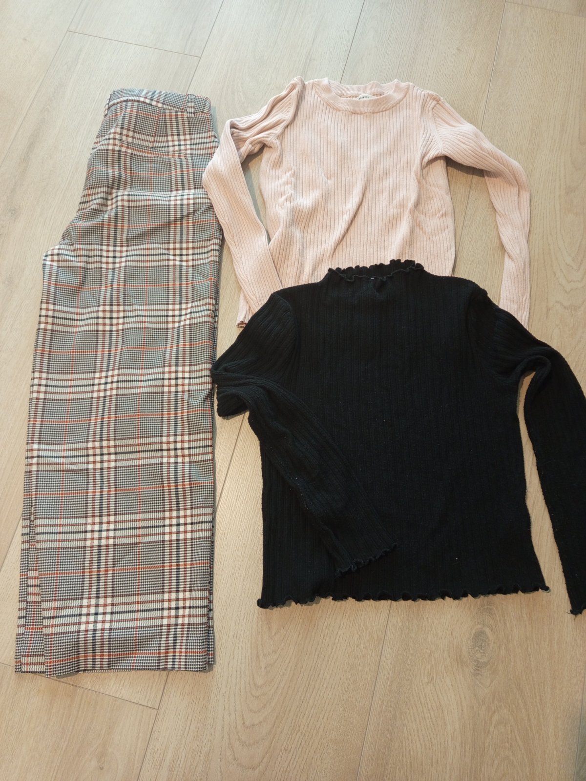 Ponúkam káro, široké nohavice, veľmi pekne sedia na postave, sem-tam žmolky, svetriky pekne hodiace sa k tomu. Svetrík ks 4€,nohavice 5€.