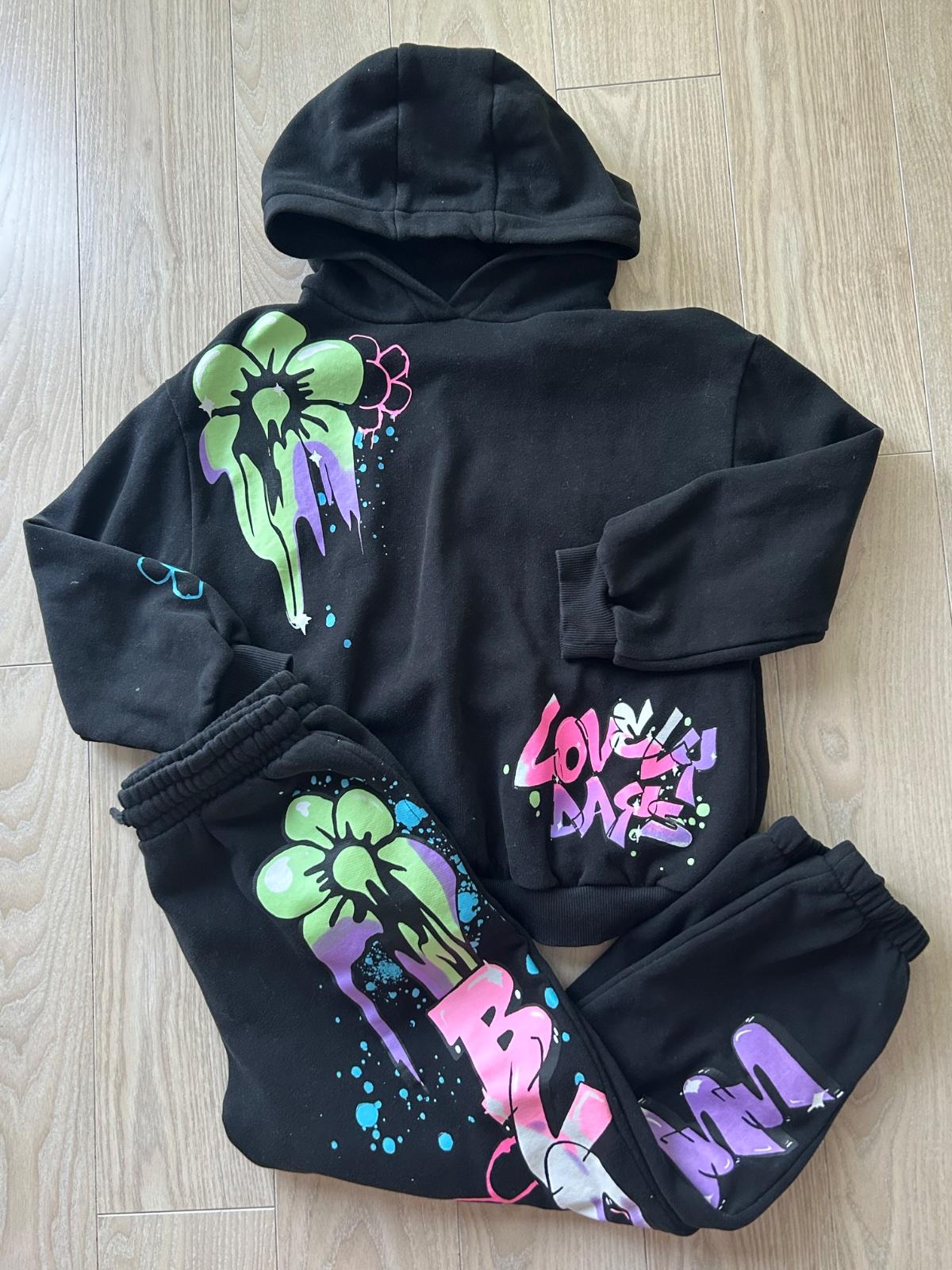 Paradna teplakova suprava pre paradnice, s grafitovym dizajnom, mikinka cez hlavu, 2 vrecka, vnutri cesany vlas, teplaky do gumy, aj na snurku, top stav, bez poskodeni