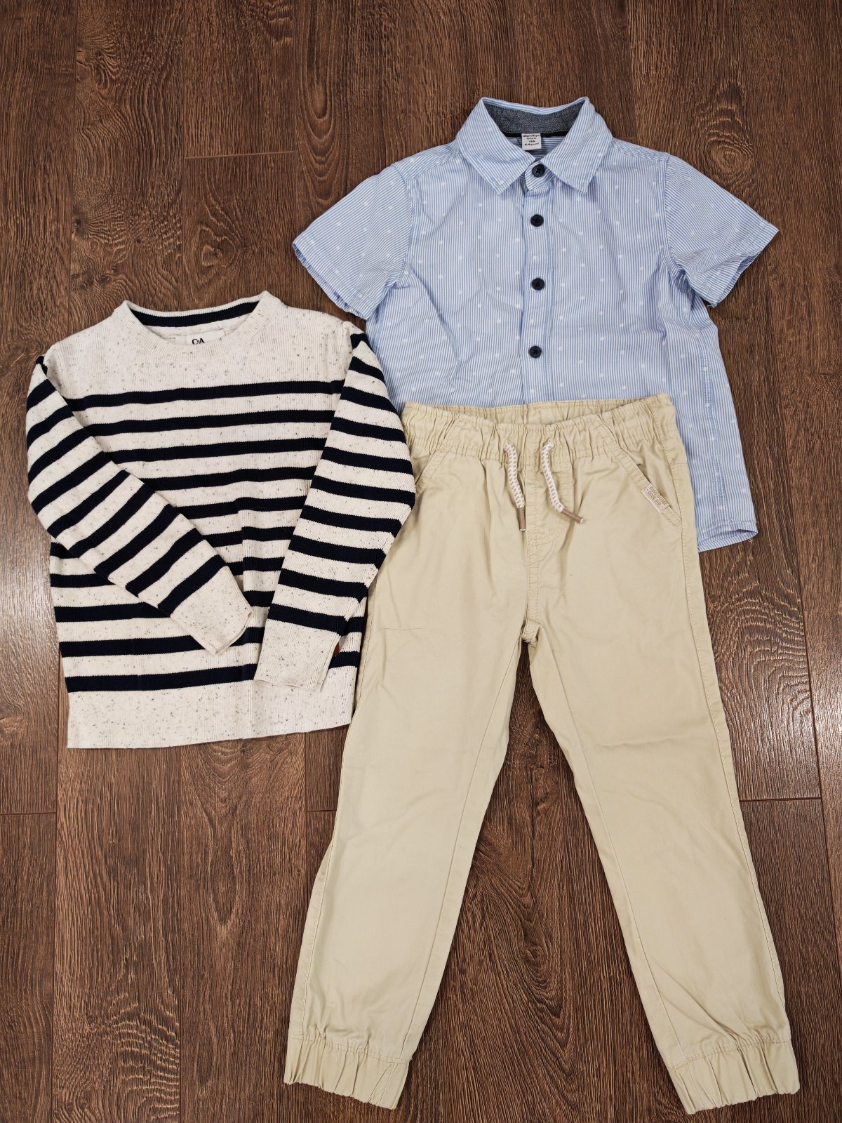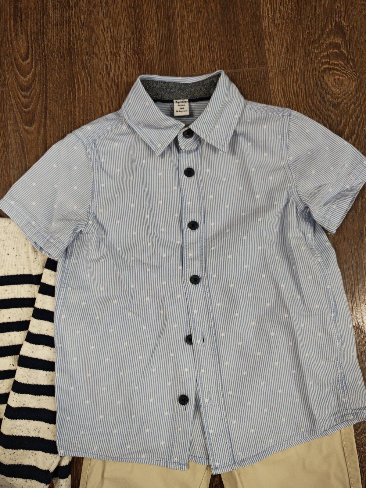 Slusny komplet na prilezitost pre chlapca, nohavice a sveter velkost 110, kosela velkost 116, pekne to ladilo spolu, aj velkostne sedelo. Oblecene 2x, ako nove.