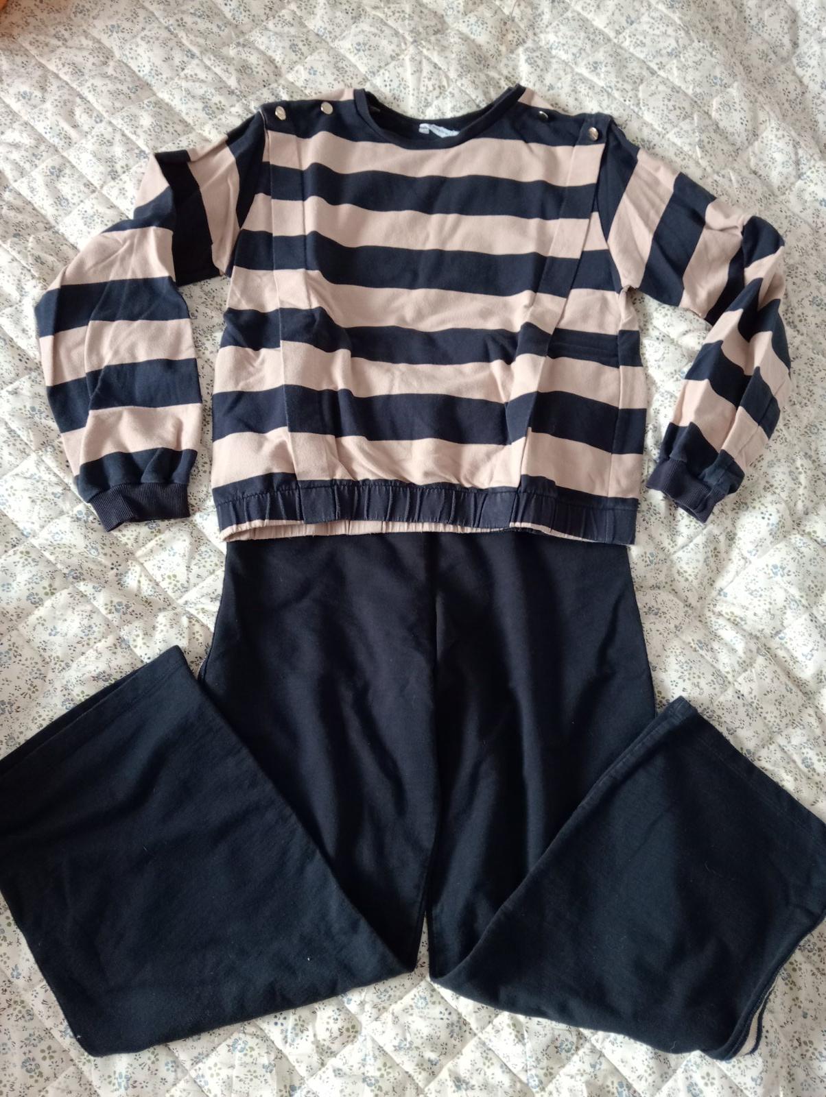 Predám bavlnený komplet Zn Mayoral. Pohodlný, voľný. Široký strih nohavíc, po stranách bledohnedý pás, v páse guma, dĺžka 91 CM, šírka v páse min. 30 CM. Tričko v páse guma, dĺžka 50 CM, šírka plecia 41 CM, rukáv od pleca 58 CM. Pekný nosený stav bez poškodení.