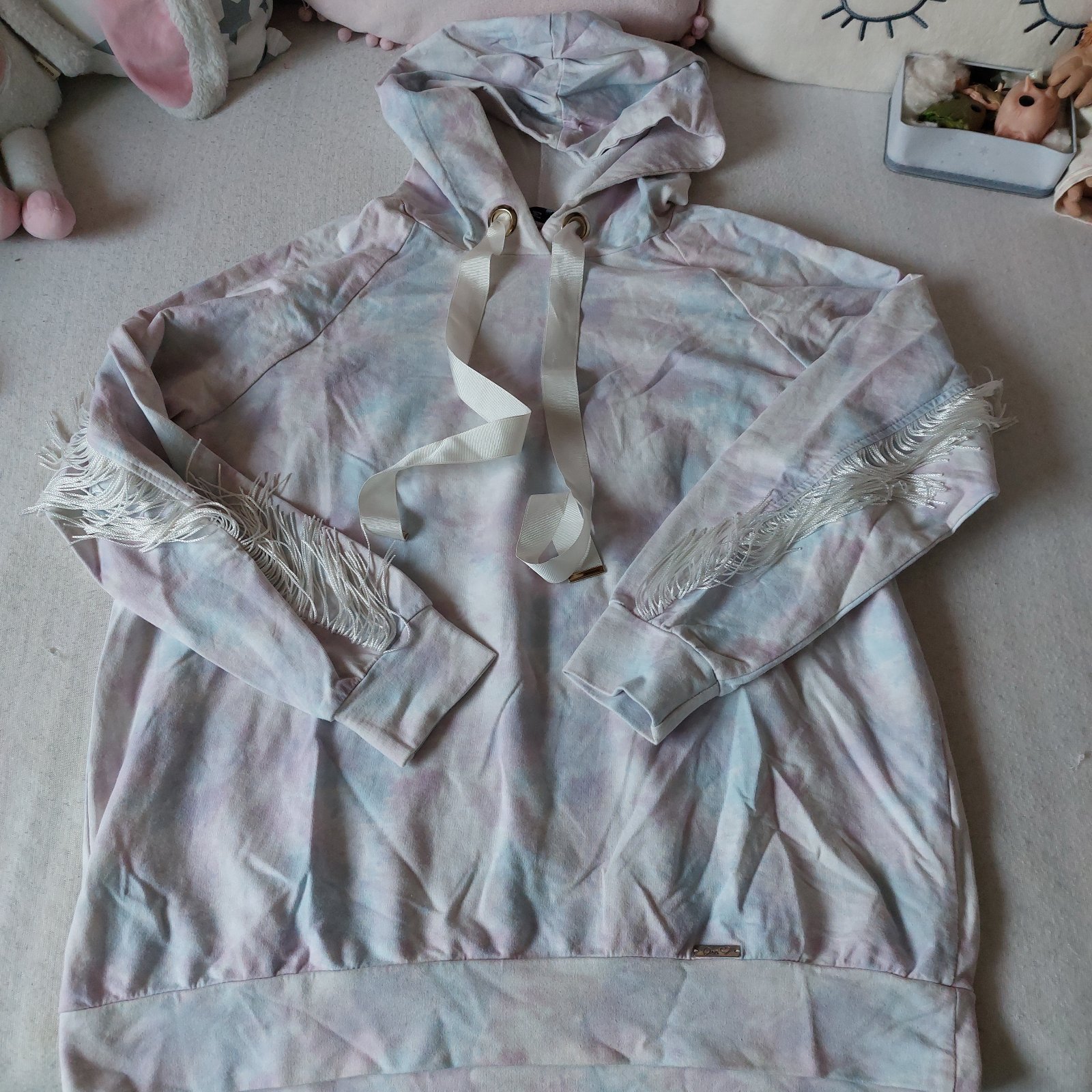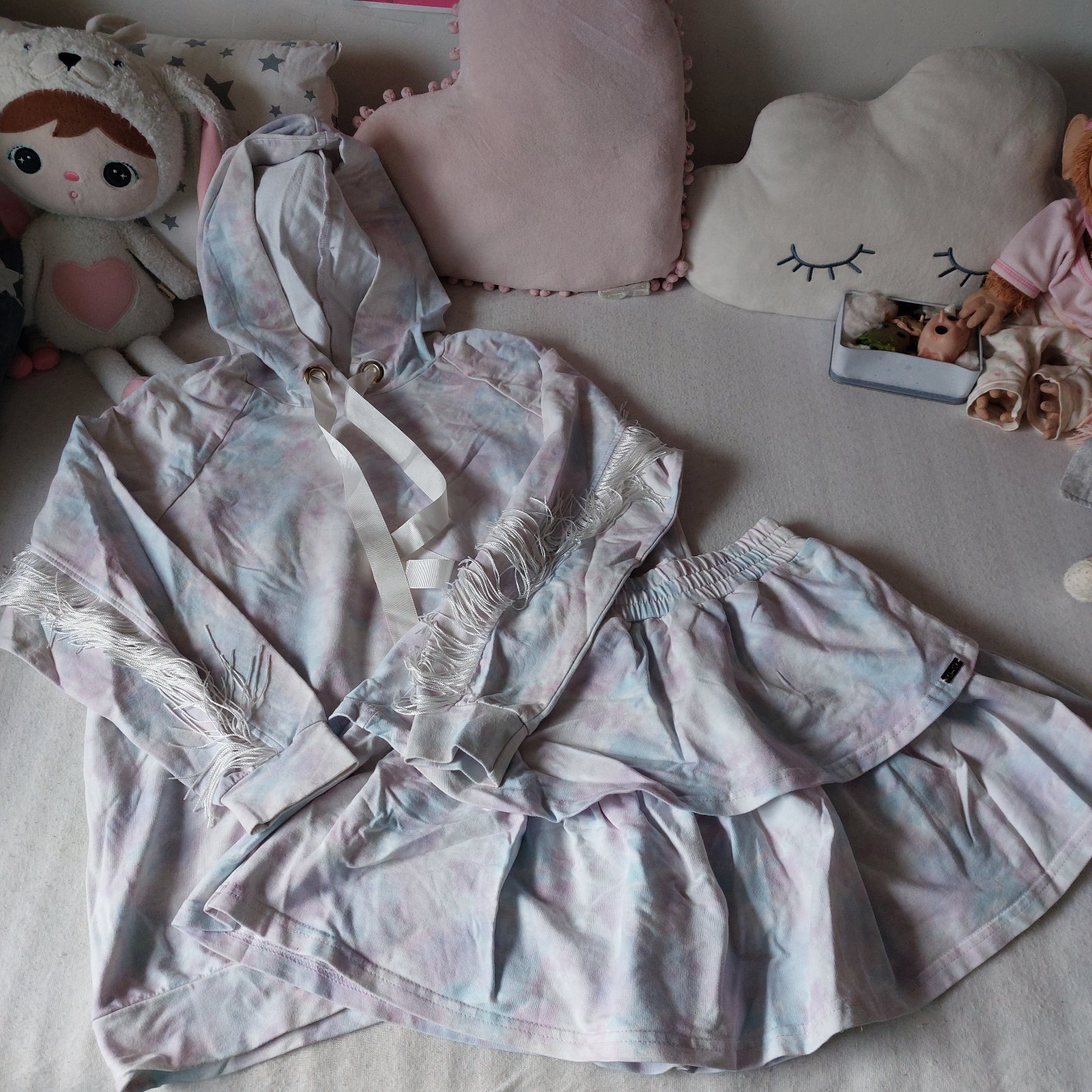 Sadne na veľkosť S/M. Krásny setik na mikine strapce na rukách aj na chrbte. Sukňa lambada. Riaďte sa mierami.