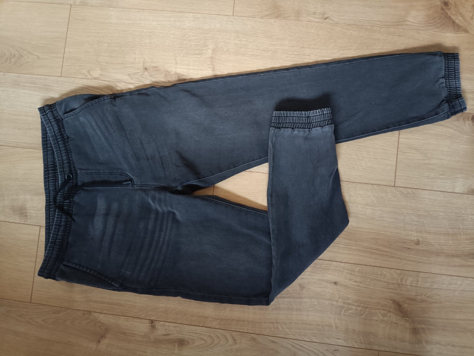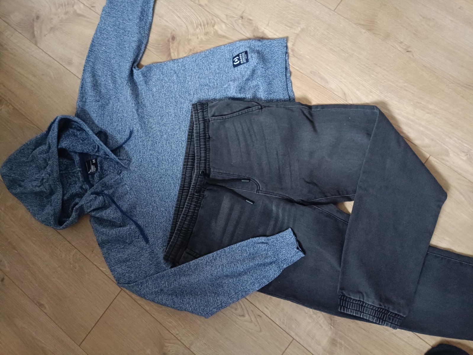 Tmavo šedé rifle Livergy, veľkosť Eu 50, dĺžka 100cm, pás na gumičku, v kľude 2x,42, tenká mikina Croop, veľkosť L, dĺžka 66, , rukáv od krku 81, šírka 55 , cena za mikinu 4,50 a za rifle 5€ pri kúpe spolu 8€ + pošta veci majú bežné známky nosenia a prania
