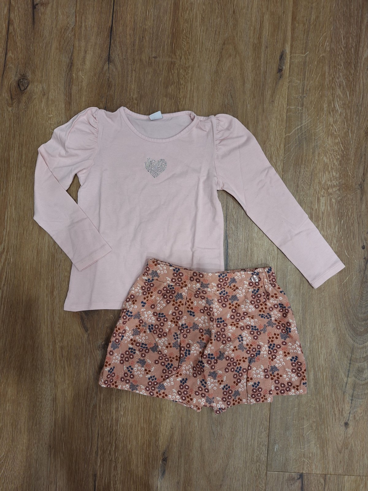 Menčestrové suknokratasy Benetton, tričko Lindex, obe párkrát oblečené, len raz prané, ale na tričku pri praní odpadlo pár kamienkov, nejako to nekričí, ale je to tam. Vydrží dlhšie