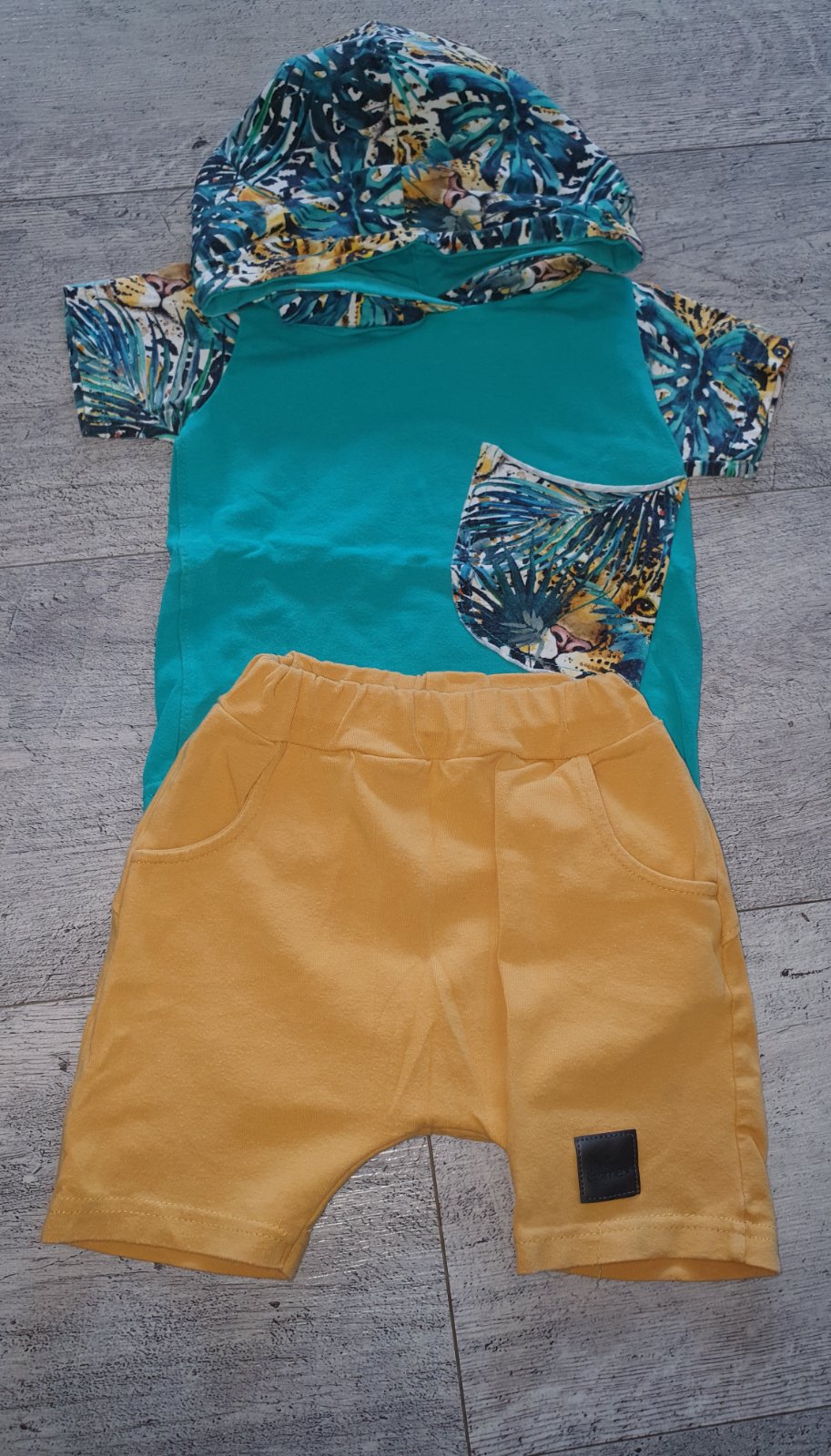 Ponúkam na predaj milý komplet z Bonprixu. Nepoškodený. Tričko je výrazne tyrkysové (ťažko odfotiť). Čiapočka malo nosená, na zaviazanie za krkom. Kraťasy trocha viac vyblednuté. Veľkosť uvedená 80...