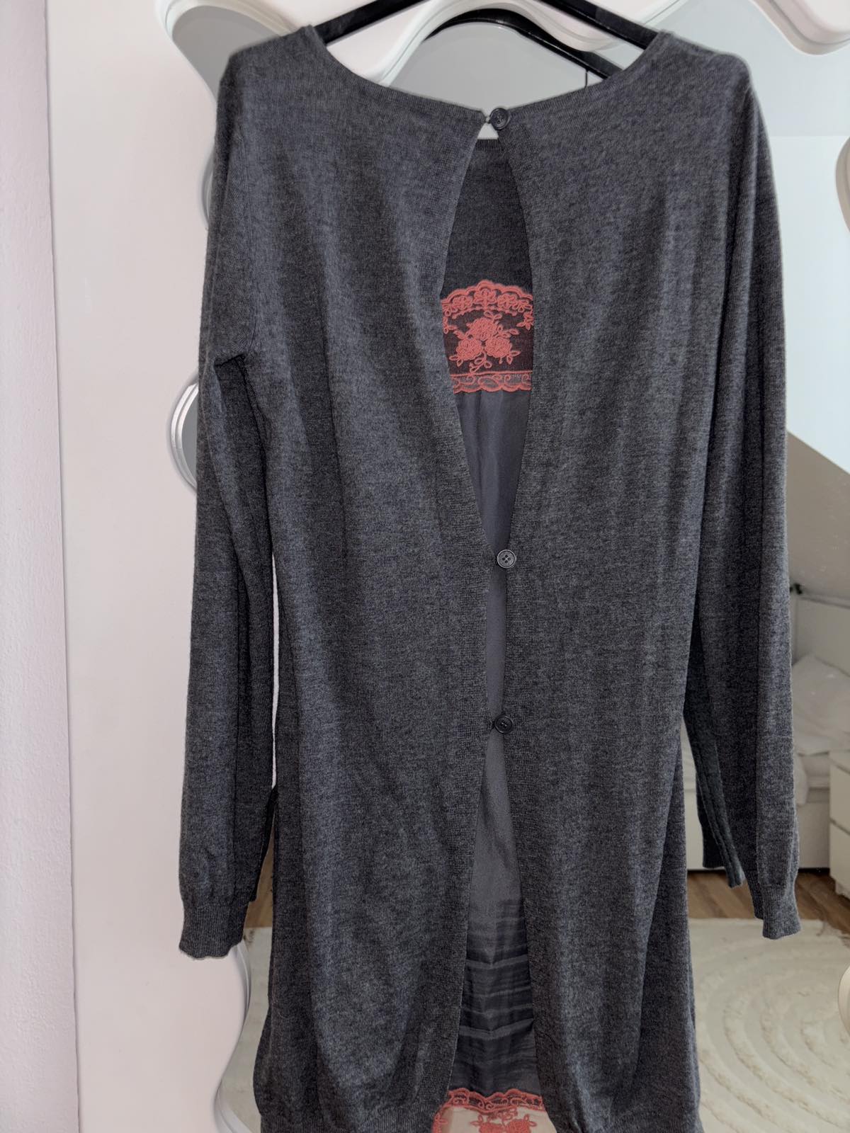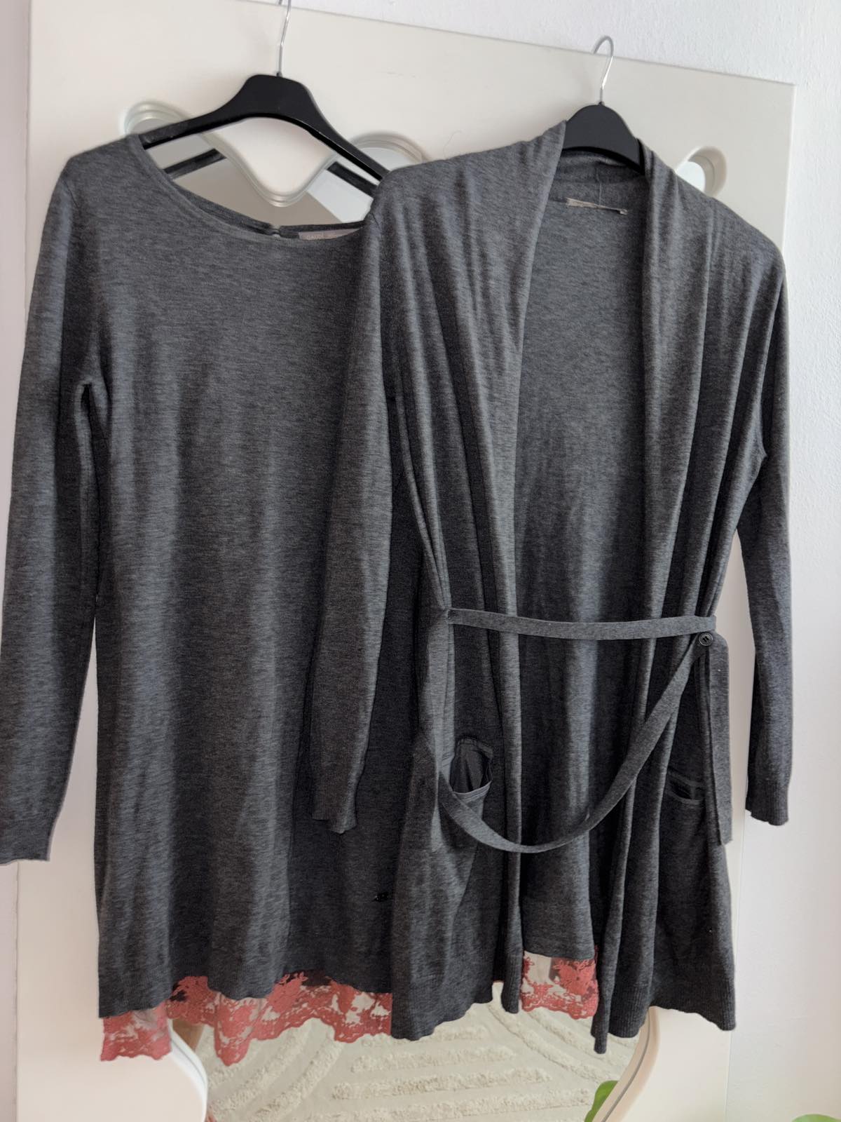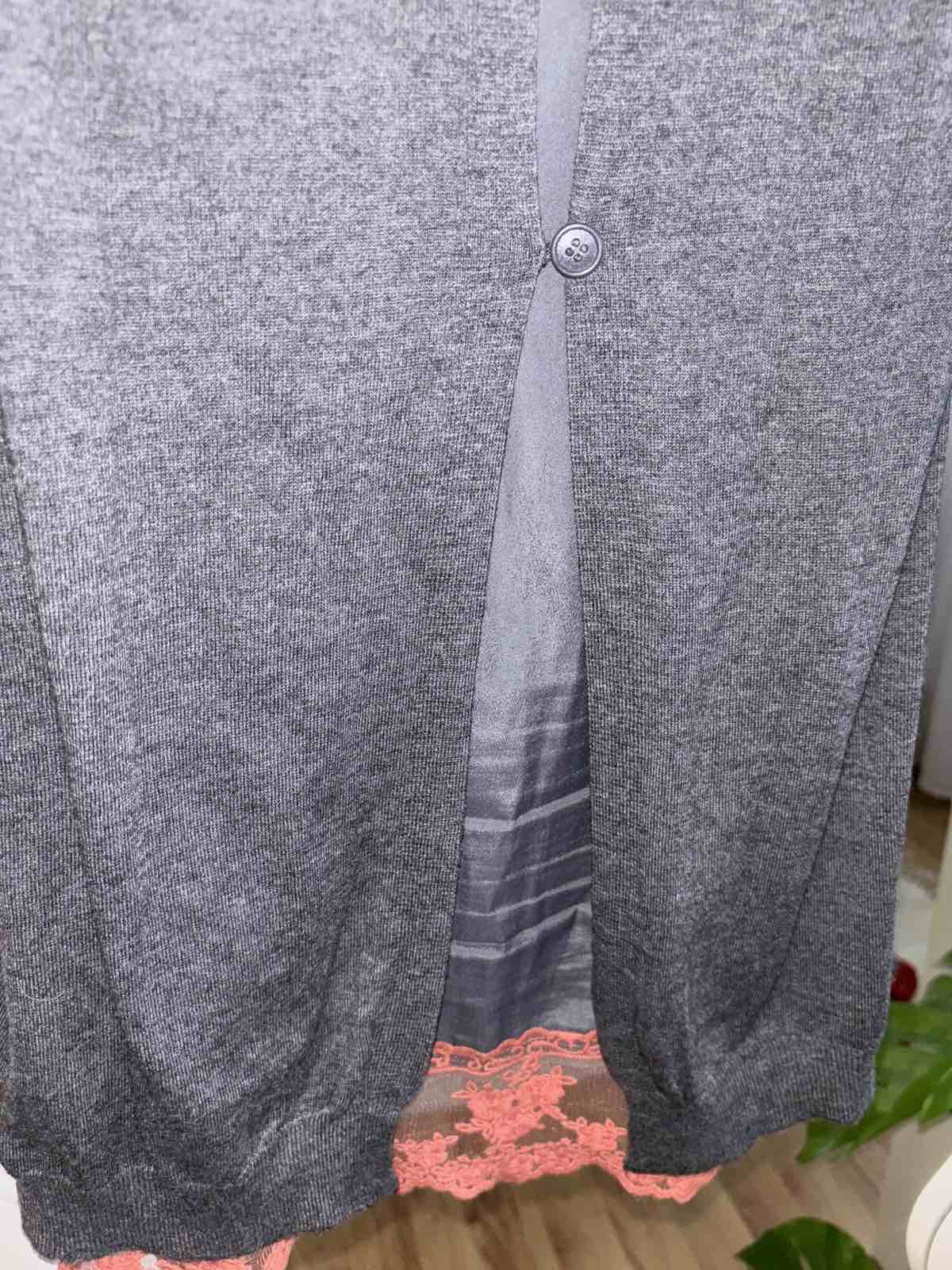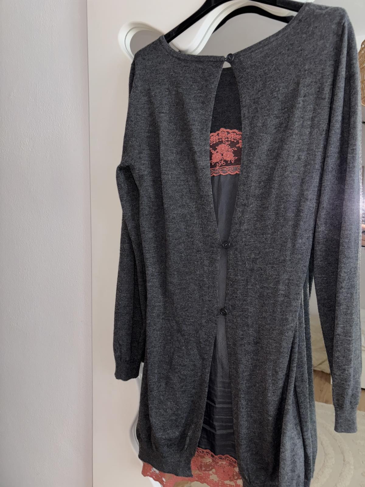 Výborný stav, šedý upletovy komplet šiat a kardiganu, zadná časť je u šiat akoby spodnicka s terakotovou čipkou, šaty veľkosť S, šírka pod pazuchami 45 cm, dĺžka 90 cm, kardigan veľkosť M, šírka pod pazuchami cca 55 cm, dĺžka 93 cm, všetko nositelne aj osobitne