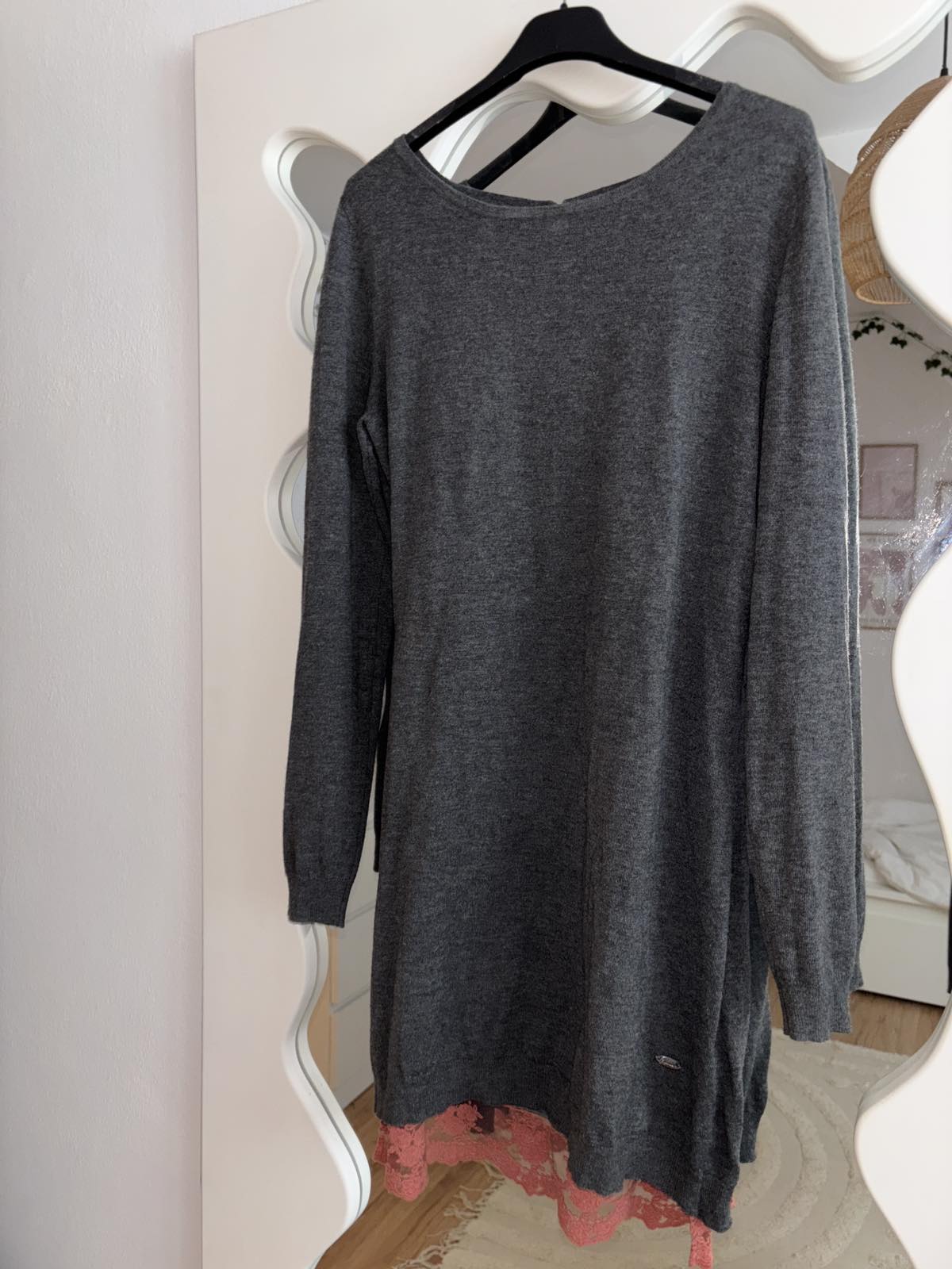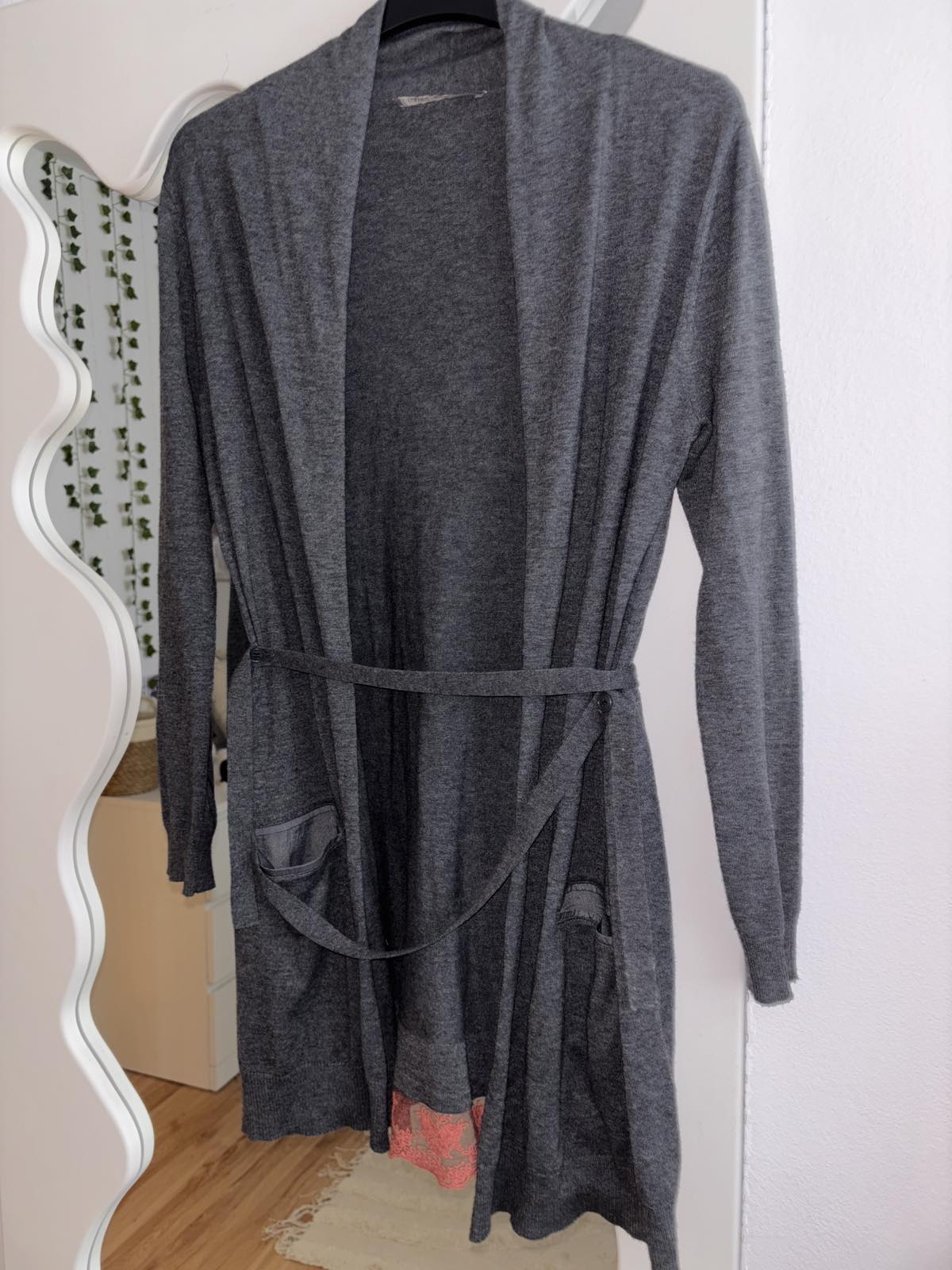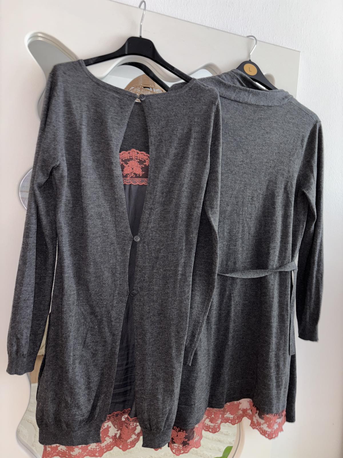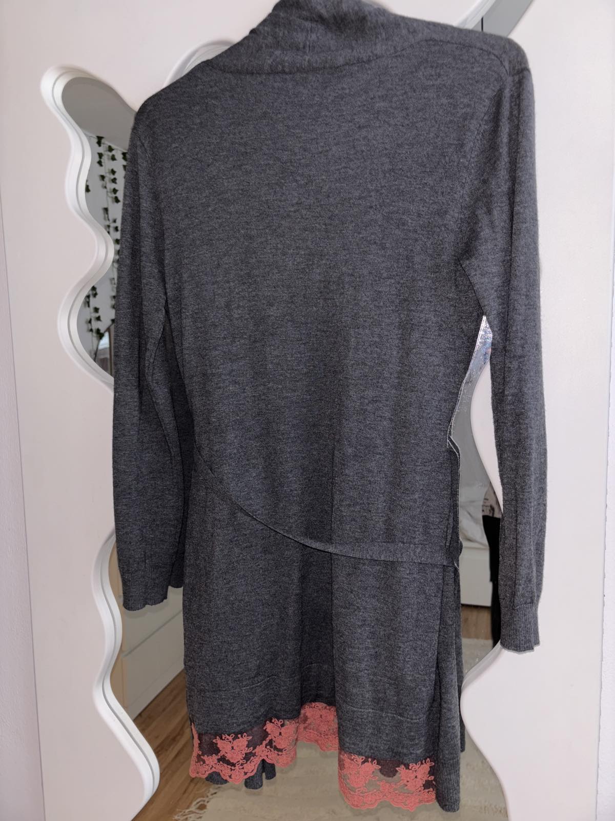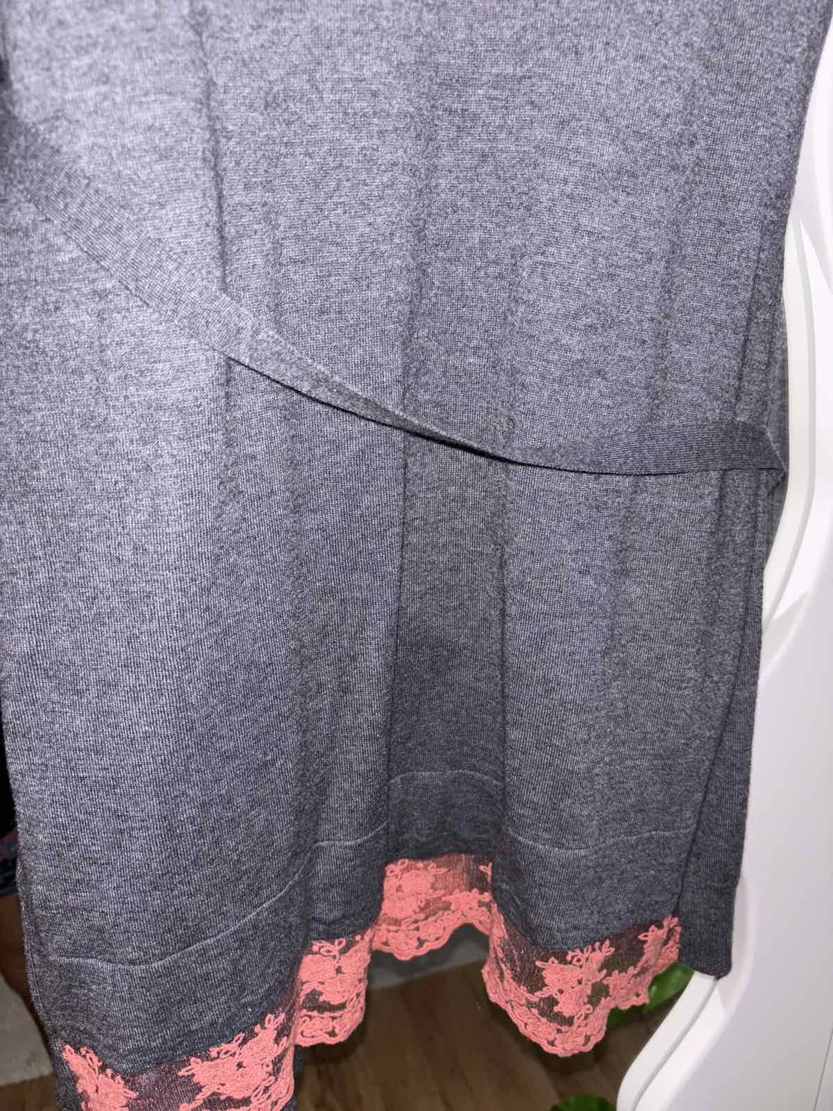 Výborný stav, šedý upletovy komplet šiat a kardiganu, zadná časť je u šiat akoby spodnicka s terakotovou čipkou, šaty veľkosť S, šírka pod pazuchami 45 cm, dĺžka 90 cm, kardigan veľkosť M, šírka pod pazuchami cca 55 cm, dĺžka 93 cm, všetko nositelne aj osobitne