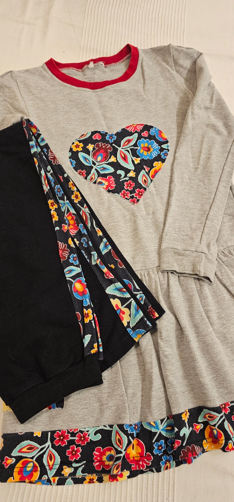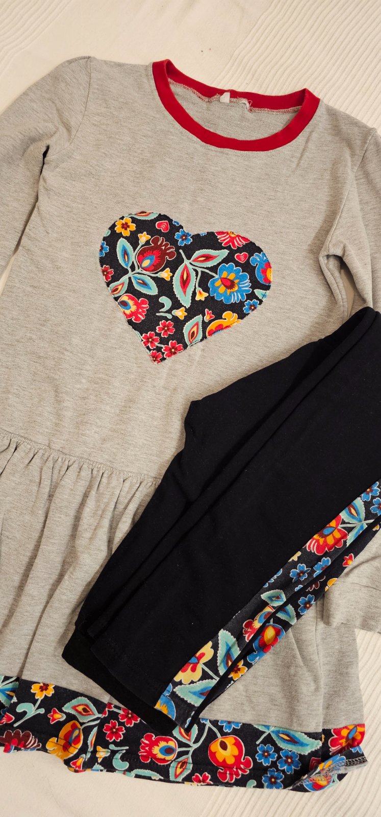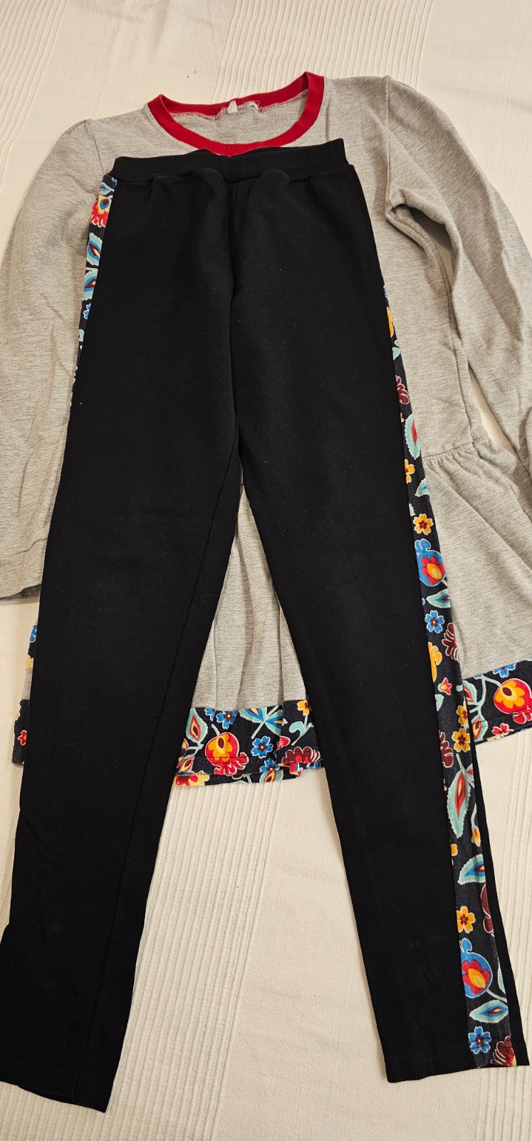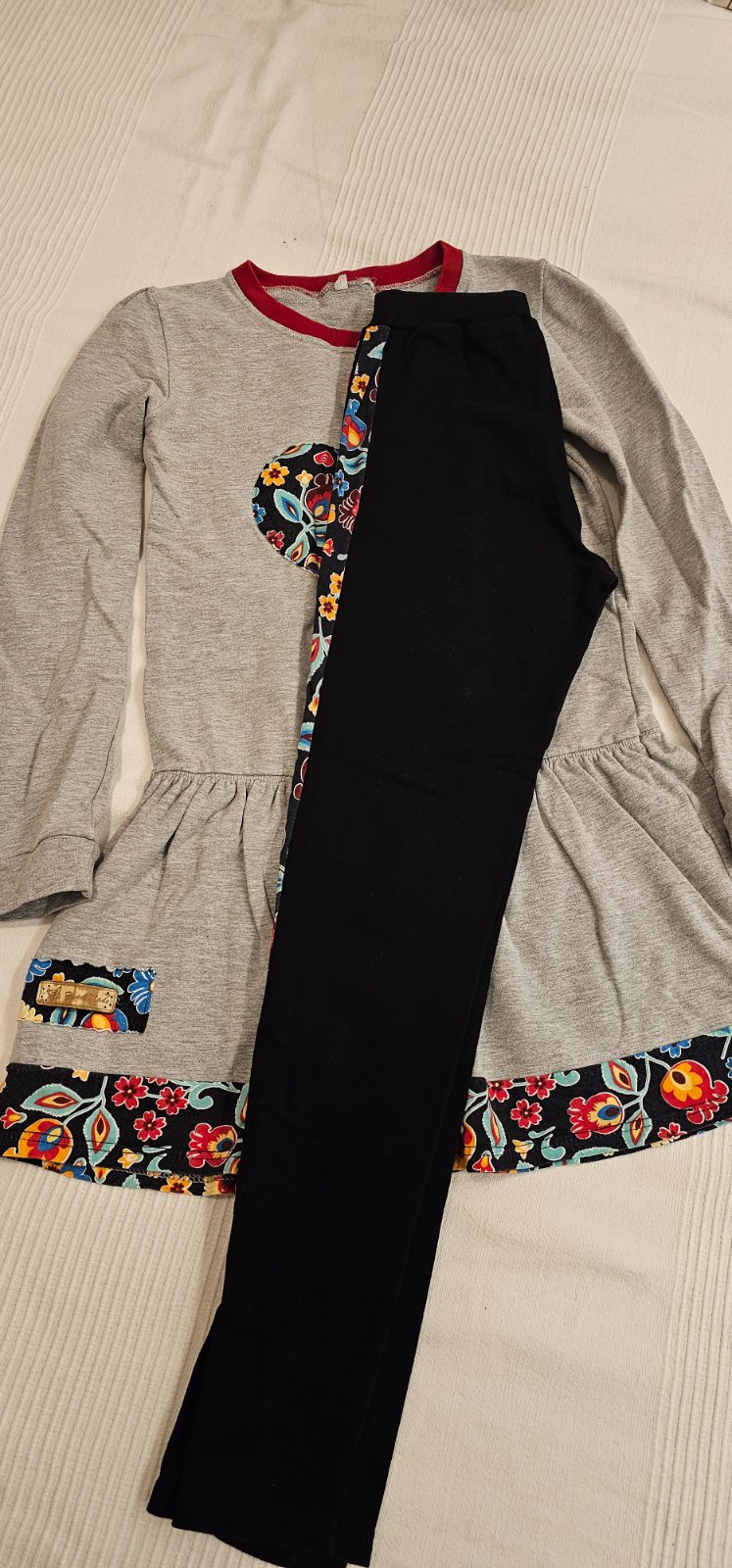Kvalitná súprava šitá na Slovensku, šaty a legíny. Šaty sa neskôr dajú vynosiť aj ako tunika. Je to trošku hrubšia bavlna, ale nie hrubá, ideálna na jar a jeseň. Pekné farebné spracovanie a pohodlný strih. Vhodná na bežné nosenie aj na nedeľu.