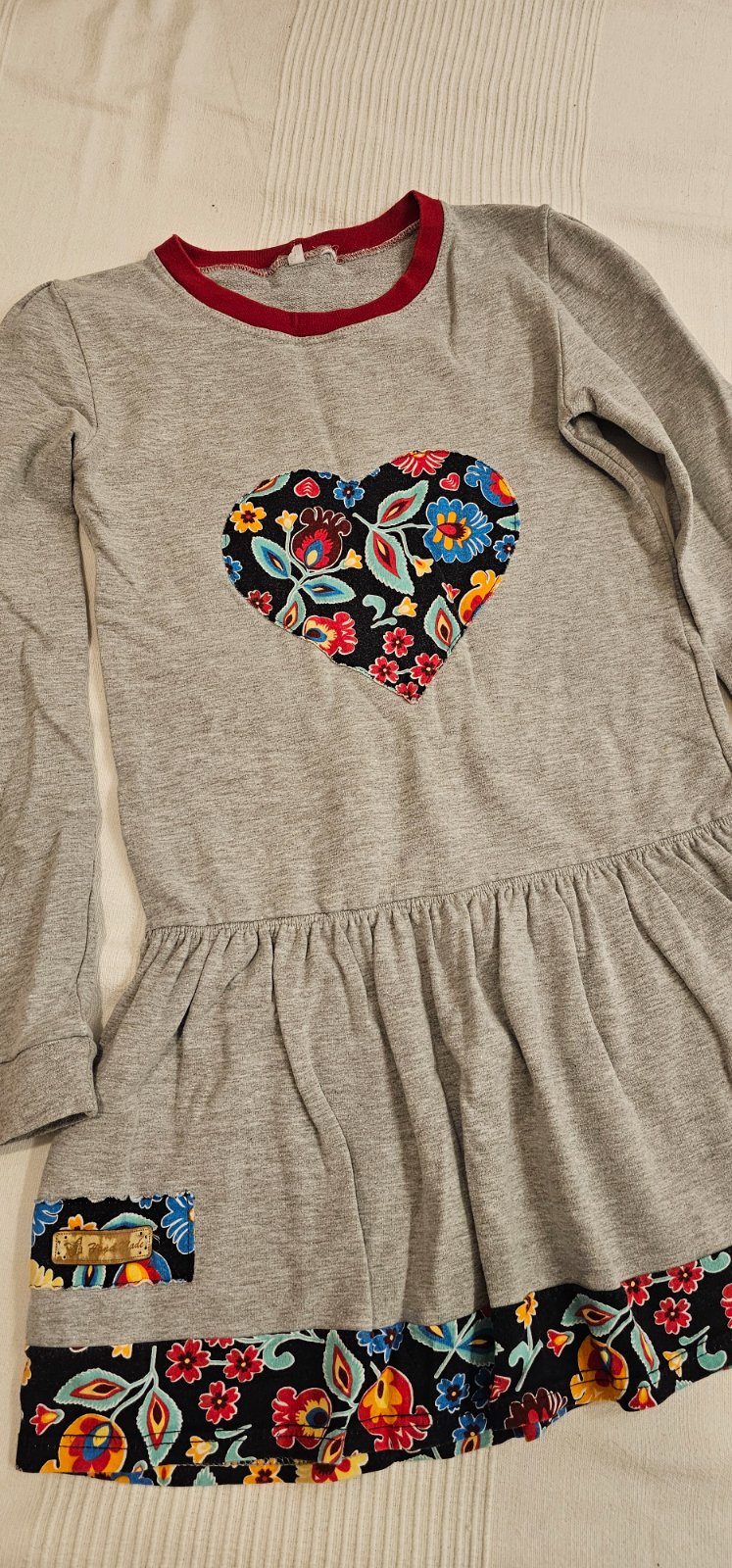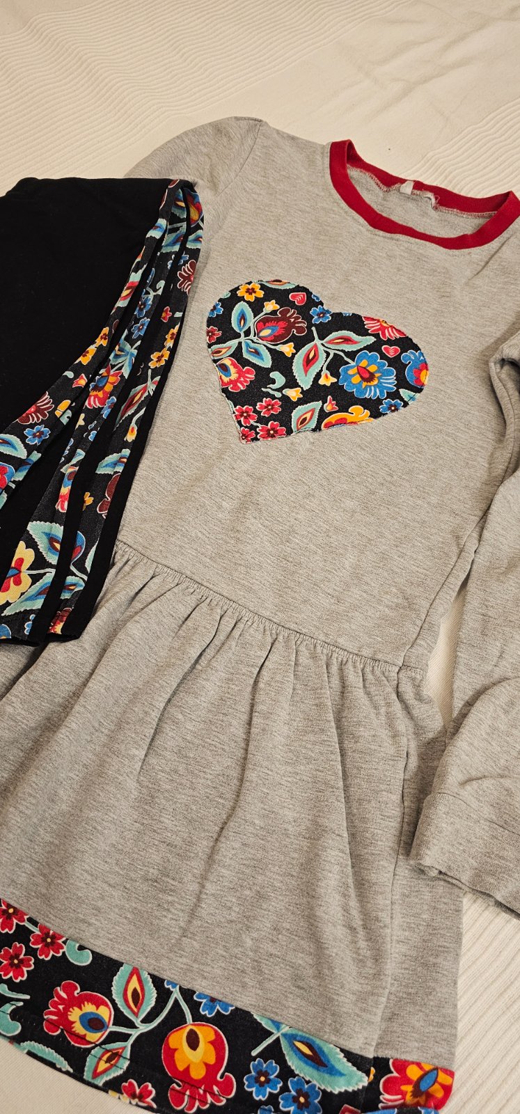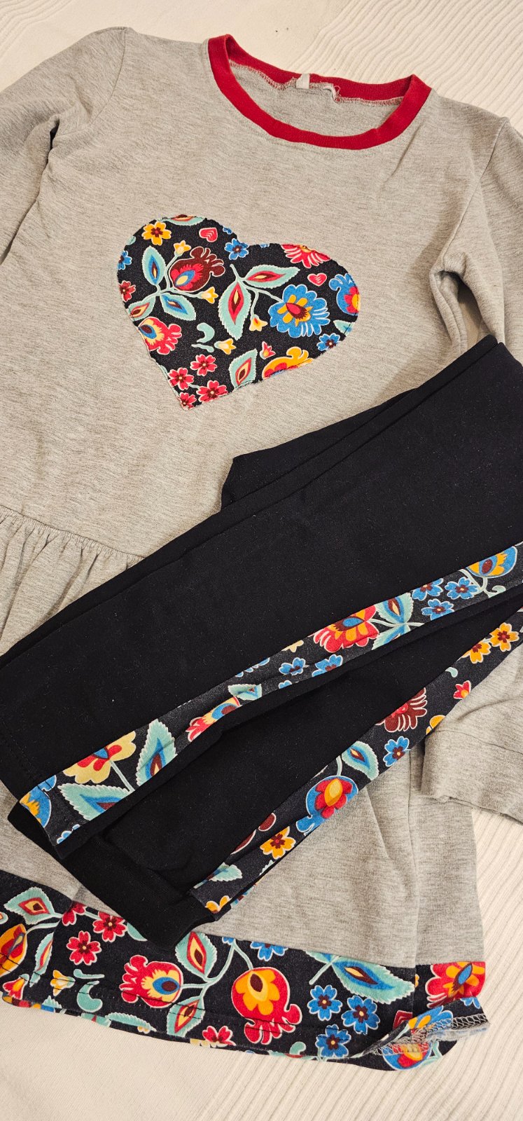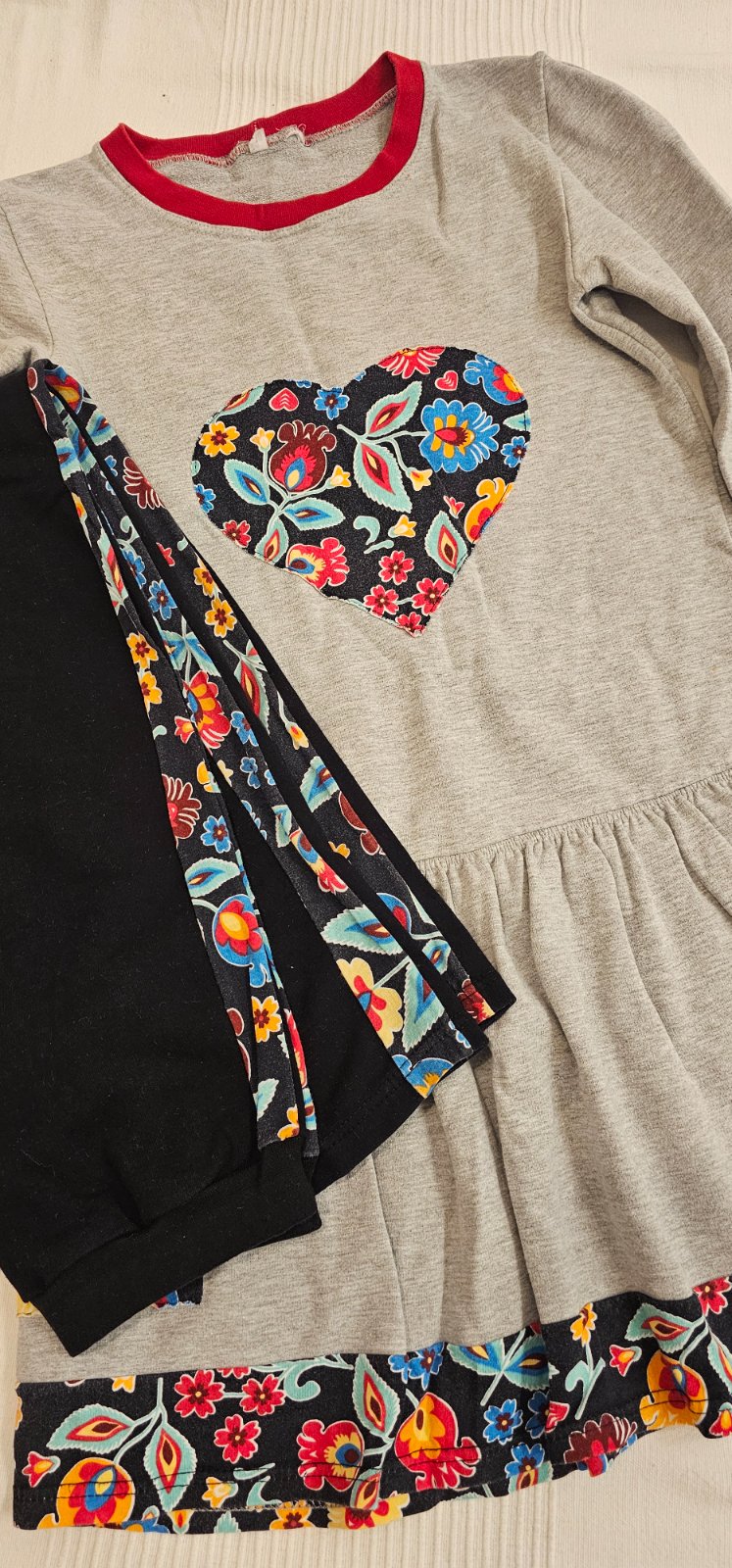 Kvalitná súprava šitá na Slovensku, šaty a legíny. Šaty sa neskôr dajú vynosiť aj ako tunika. Je to trošku hrubšia bavlna, ale nie hrubá, ideálna na jar a jeseň. Pekné farebné spracovanie a pohodlný strih. Vhodná na bežné nosenie aj na nedeľu.