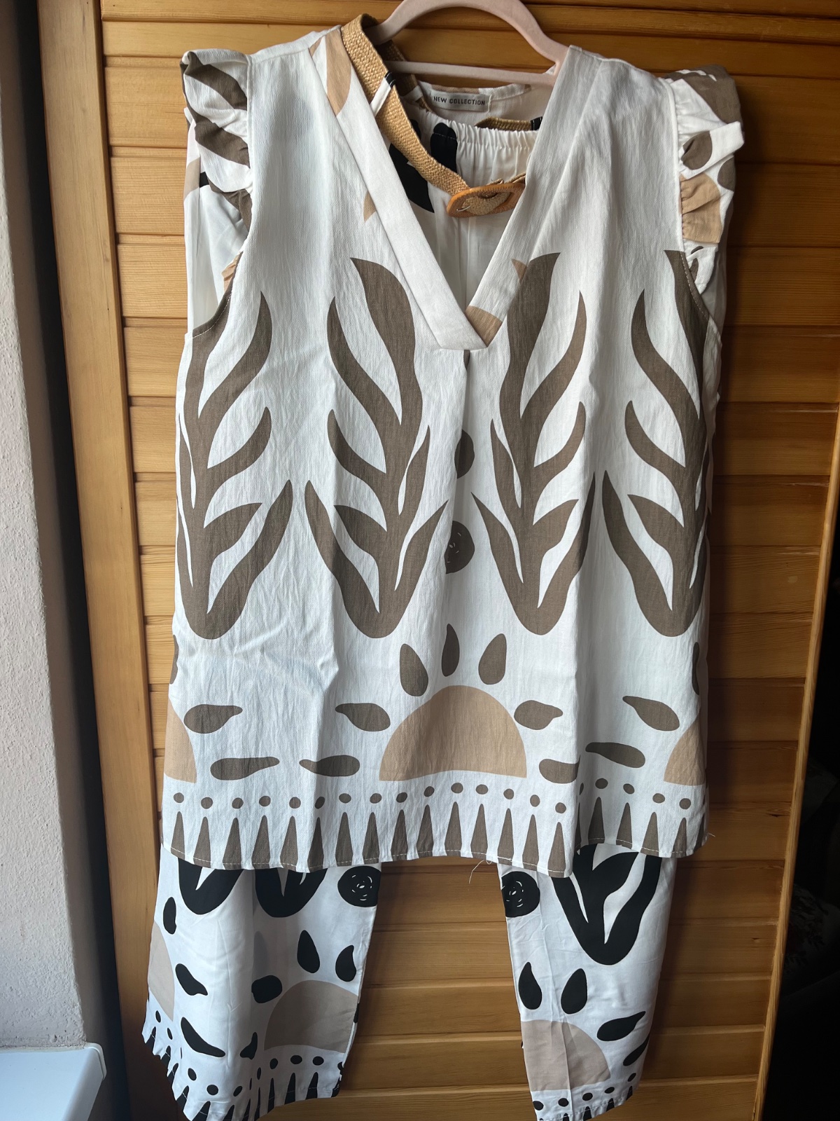 Perfektný ľahučký komplet! Treba sa riadiť mierami! Nohavice: dĺžka - 100 cm, pás - max. 2x 45 cm, boky - 2x 55 cm. Vrch: dĺžka - 63 cm, netopierí strih.