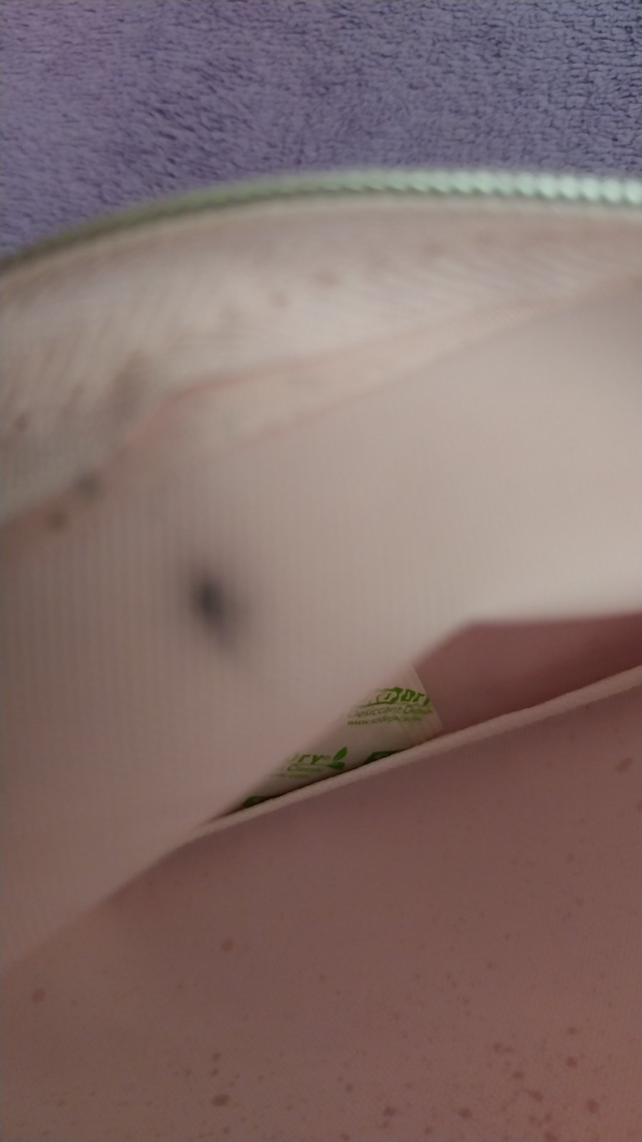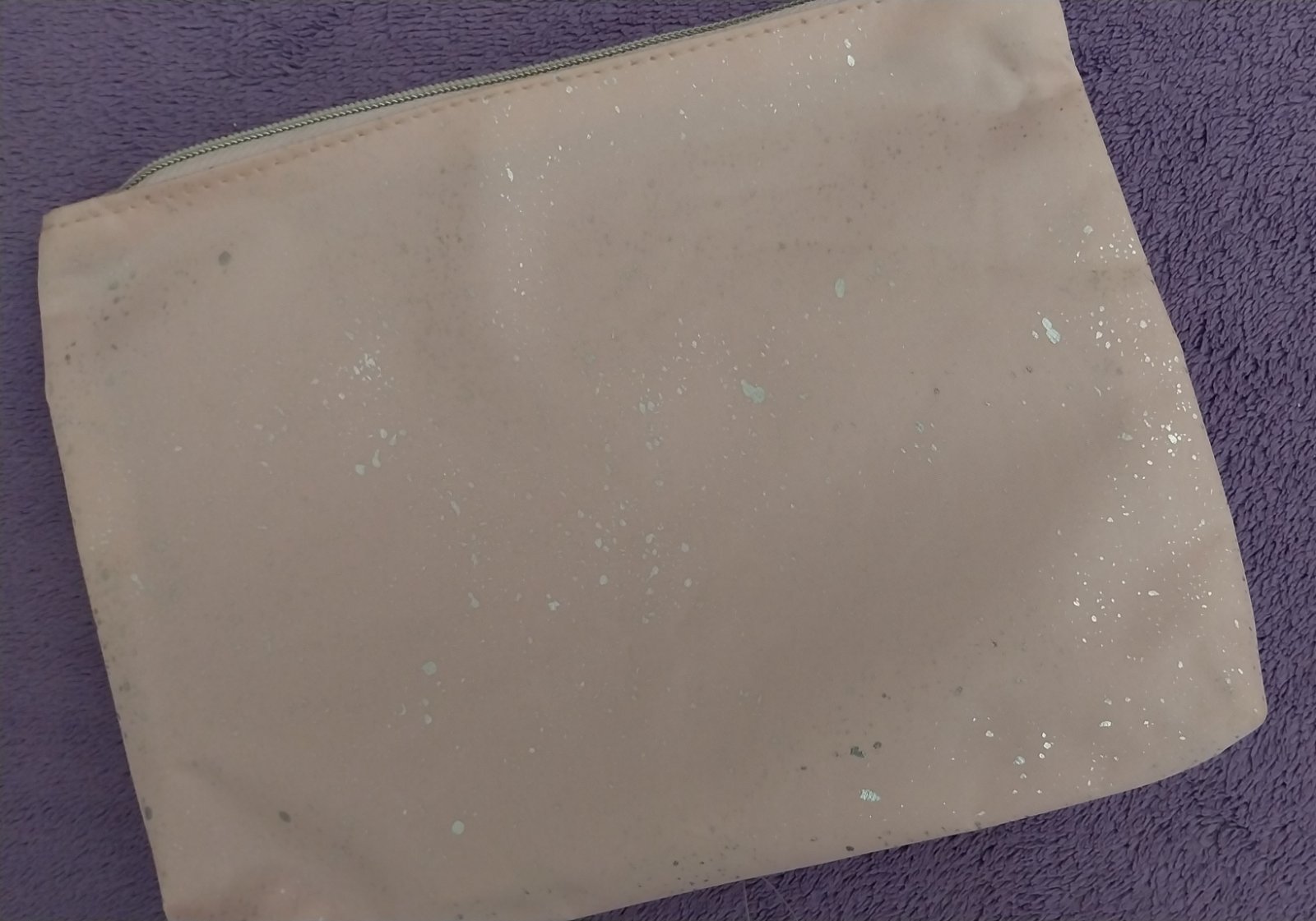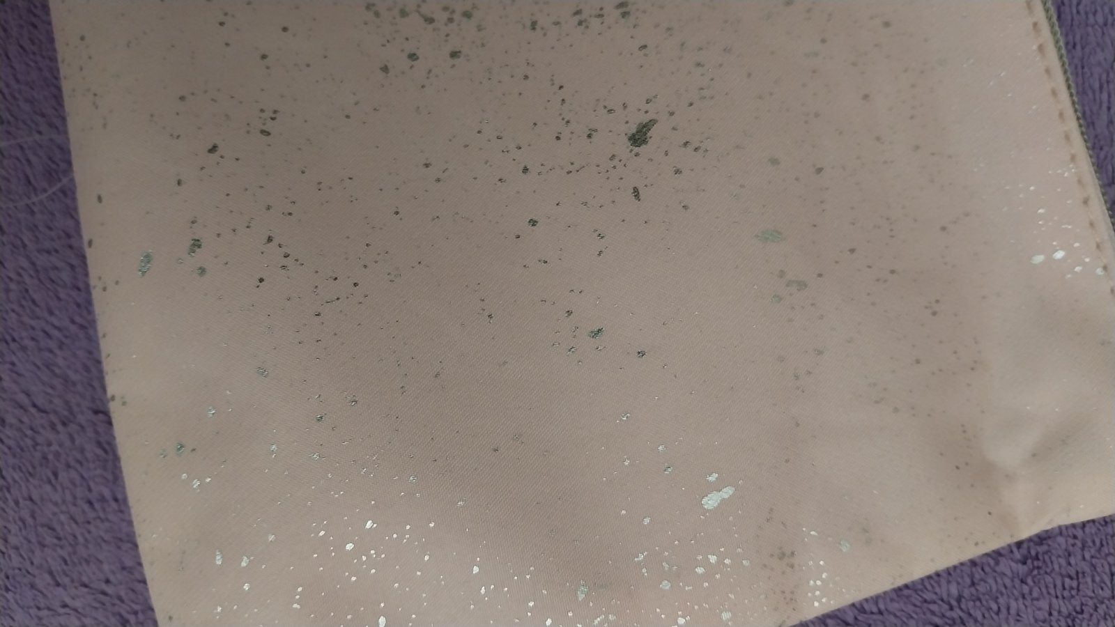 Ružová kozmetická taštička s trblietkami. Vo vnútri maličká čierna škvrna.