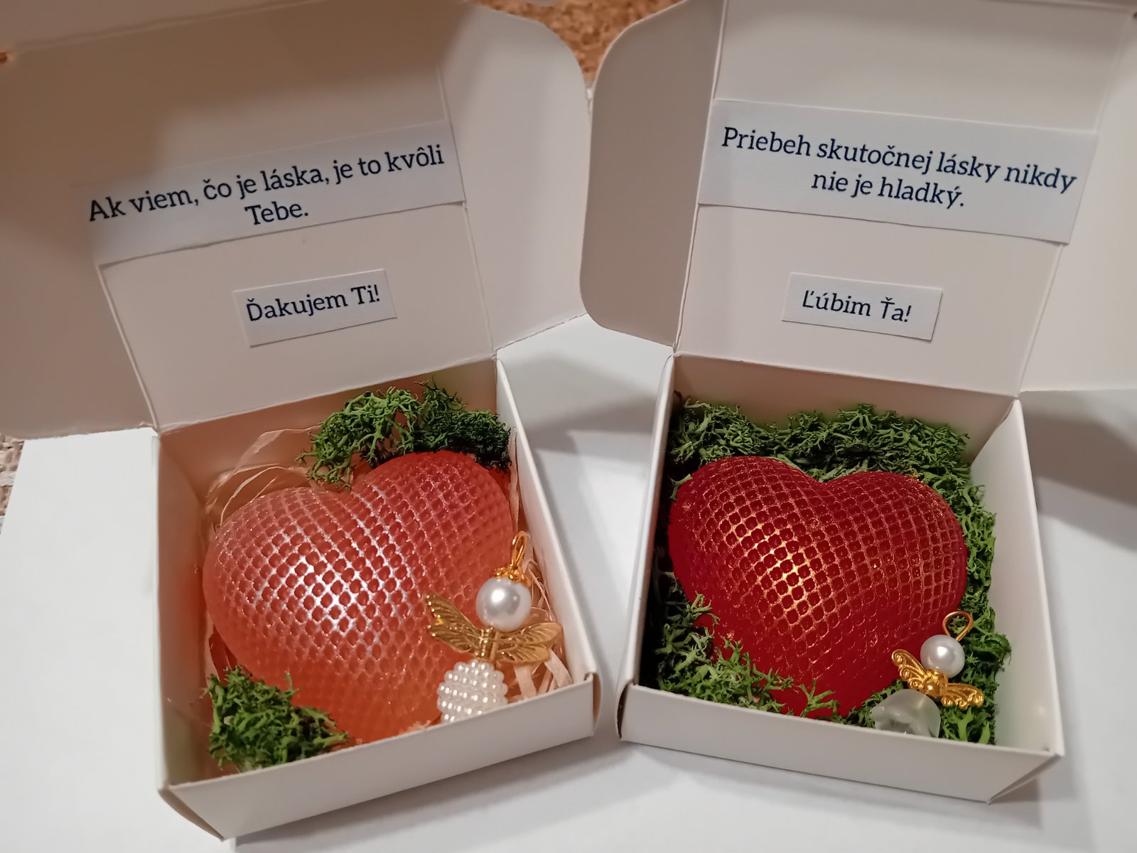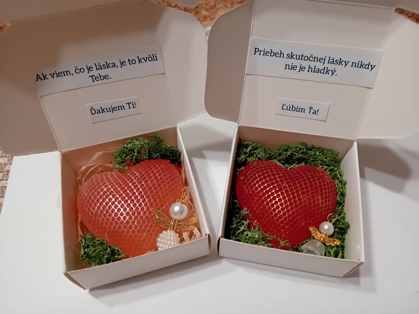 Krabička s mydlom alebo sviečkou s citátmi podľa želania dekorované machom, perleťou a s príveskom anjelika. Drevené srdiečko je možné personalizovať vypálením.