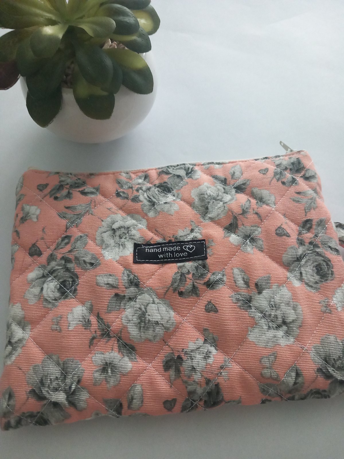 Dámska kozmetická taštička alebo taštička na drobnosti ,či ženské potreby ušitá z kvalitnej bavlnenej látky . Taštička je marhuľovej farby so vzorom ruži, podšitá vatelínom , poprešívaná pre lepšiu pevnosť a podšitá 100 % bavlnou Zapínanie je na zips pre lepšie zapínanie Taštičku viete prať v pračke na 40 stupňov Rozmery taštičky sú 19 x24 cm