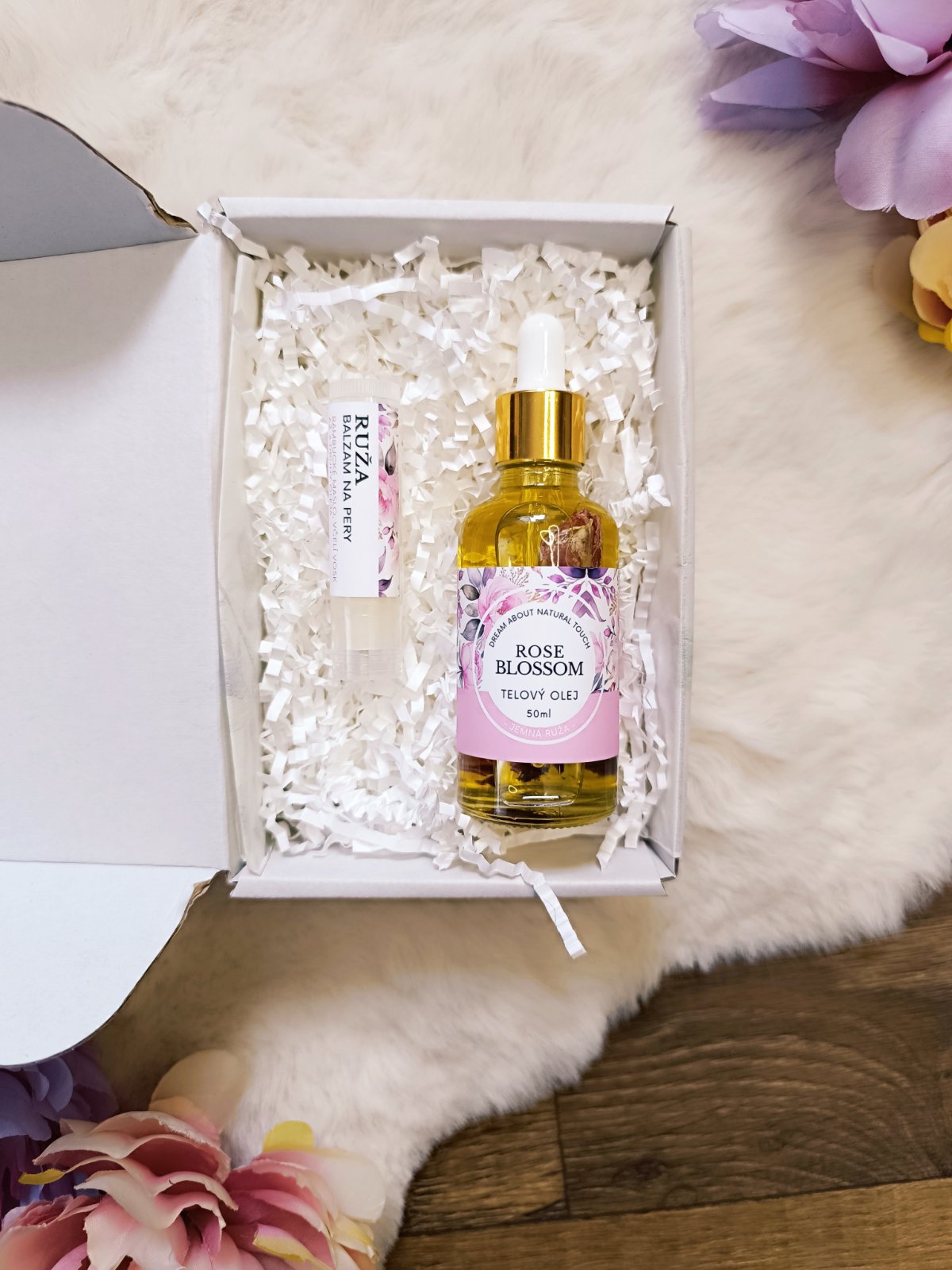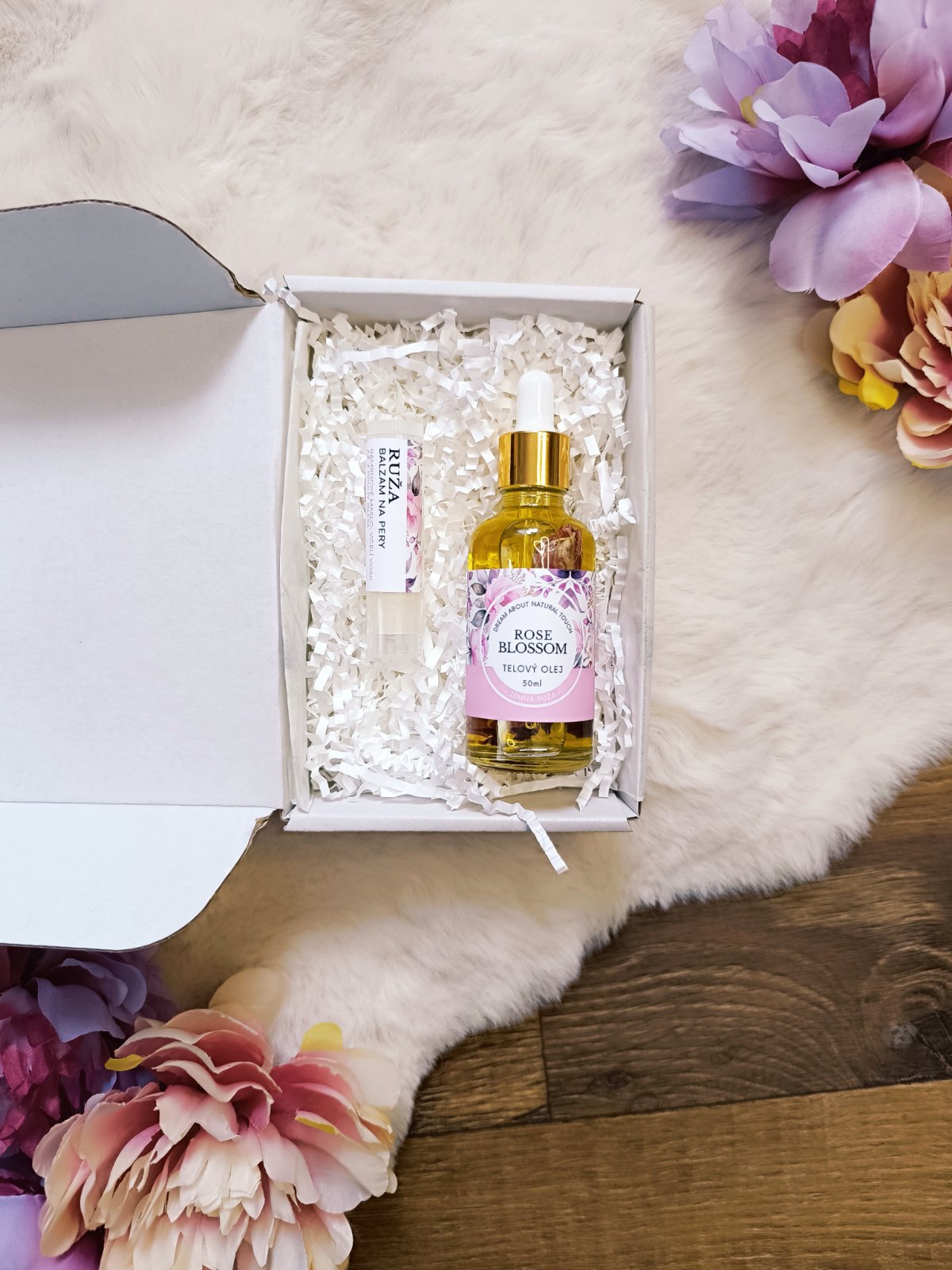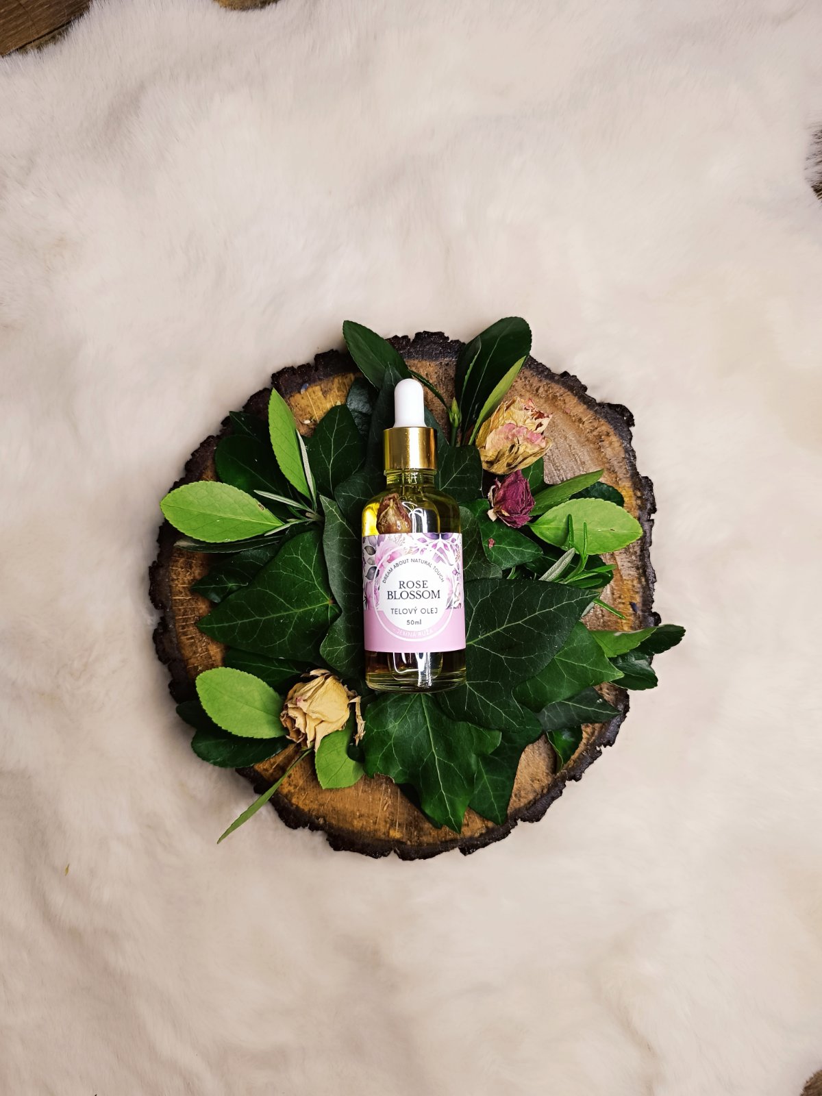 Luhovaný telový olej Ruža – výživná zmes bio slnečnicového, kokosového a olivového oleja s vitamínom E, luhovaná v okvetných lístkoch ruže. Pokožku zjemňuje, hydratuje a dodáva jej pocit hebkosti.