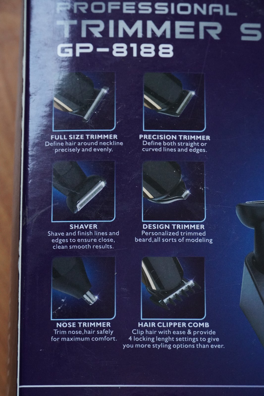Funkcie: Zastrihávač brady, zastrihávač na vytváranie dizajnov, zastrihávač na presné zastrihávanie, zastrihávač chĺpkov v nose, strihač vlasov s nastaviteľnou dĺžkou strihu