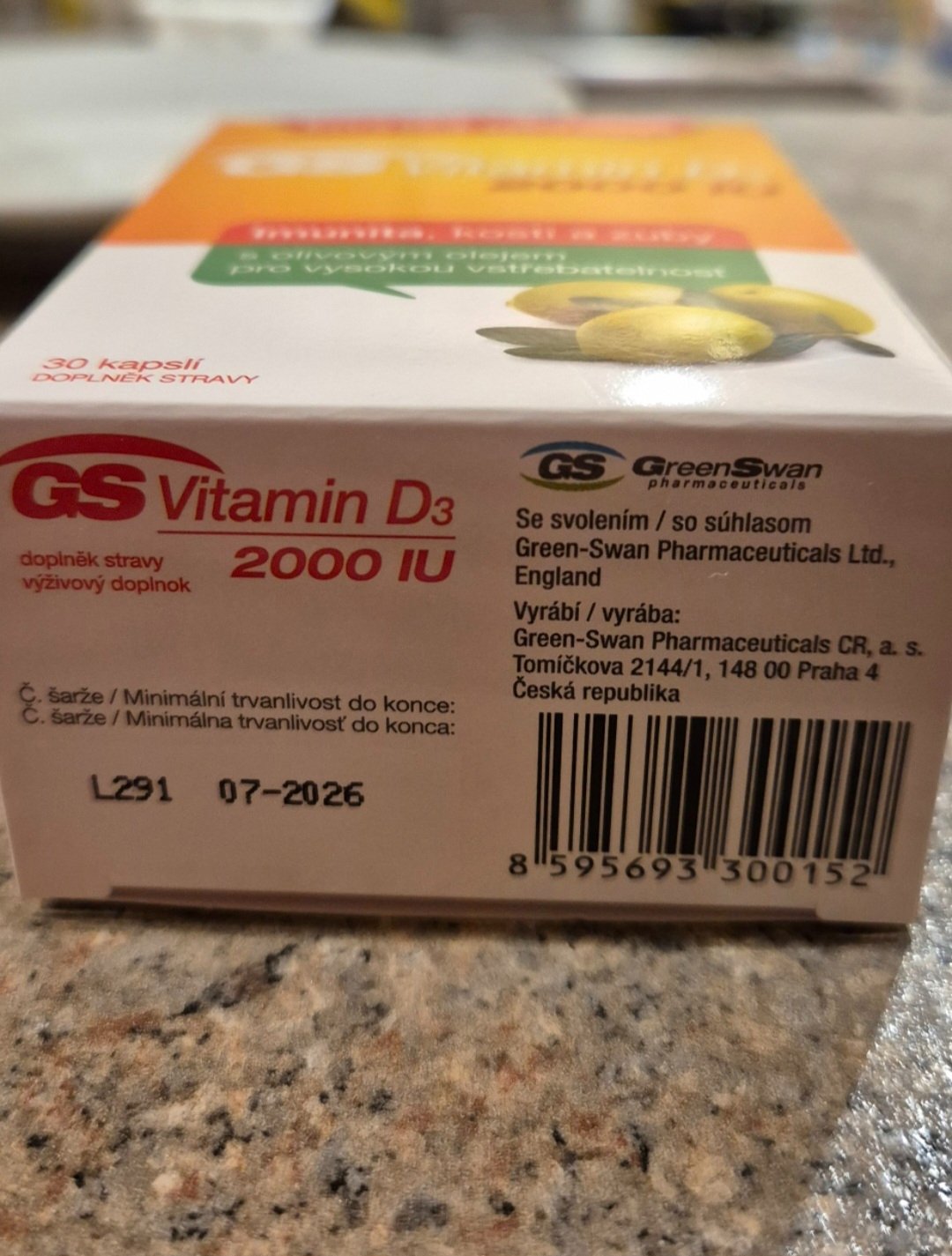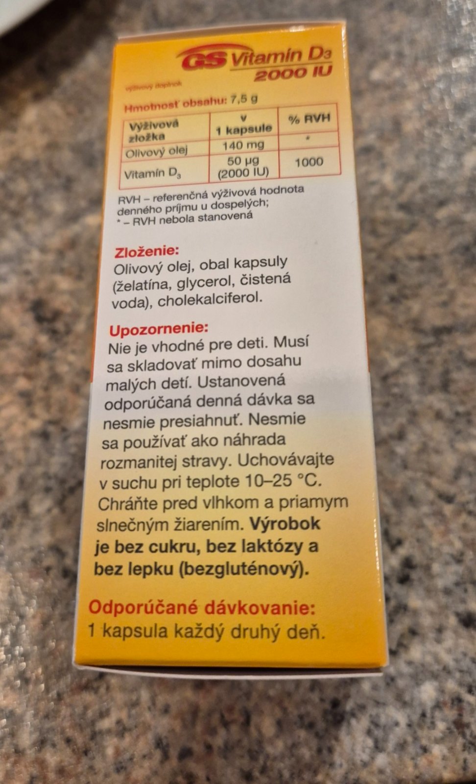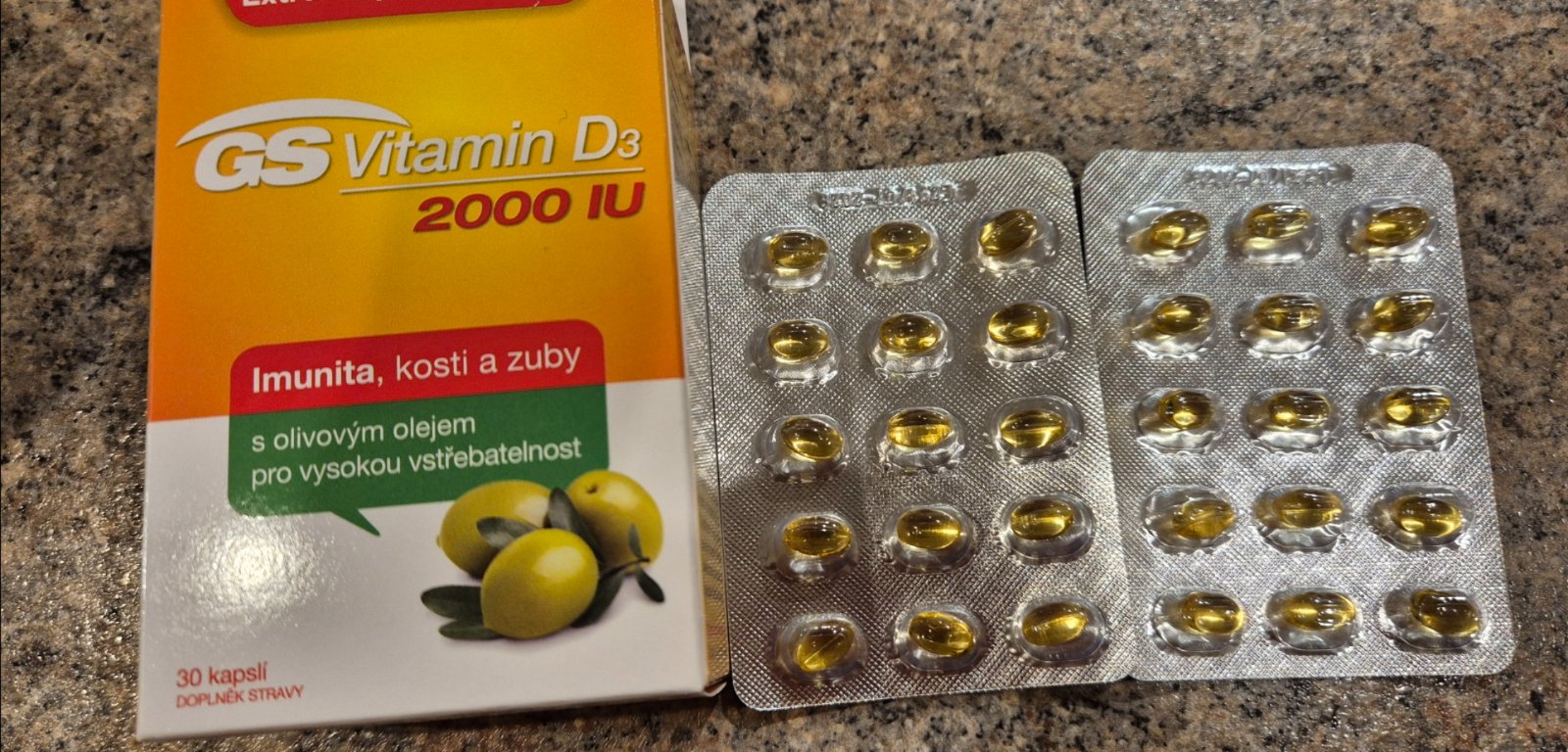 Nerozbalene, nevhodný dar, dátum spotreby 07/2026kapsula obsahuje: vitamín D3 (cholekalciferol) 2000 IU, olivový olej 490 mg