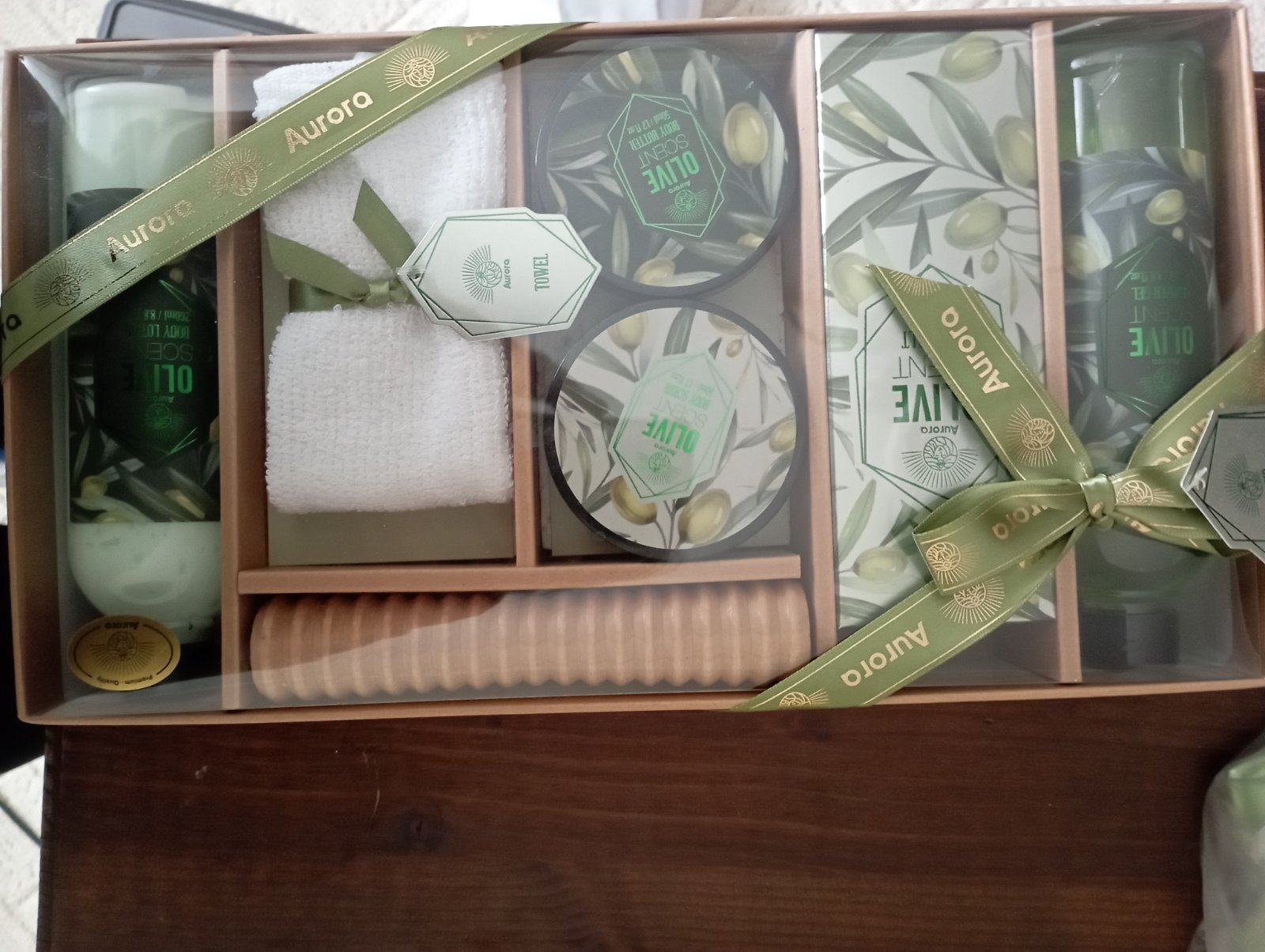 Darčekové balenie telovej kozmetiky Aurora Olive Scény obsahuje: telový šampón, telově mlieko, soľ do kúpeľa, telový scrub, telové maslo, uteráčik a masážny valček.