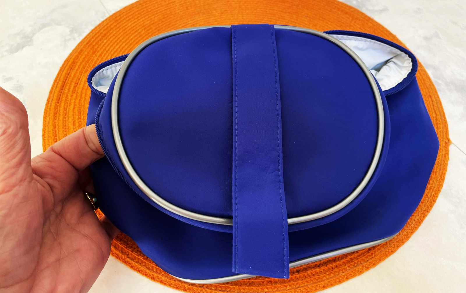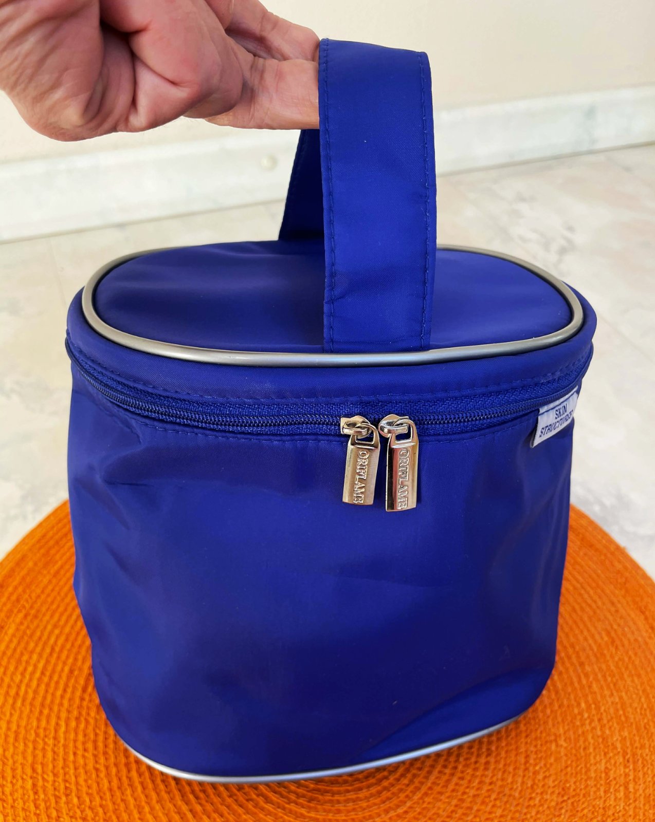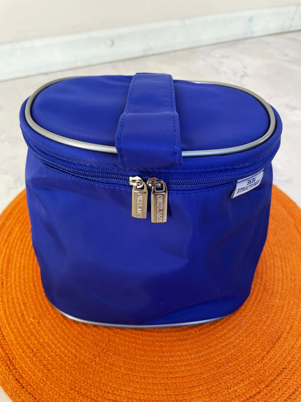 krásny kozmetický kufrík, výrazná stredne modrá farba so strieborným lemovaním,vyrobený z odolnej syntetickej tkaniny (polyester), dnu umývateľný povrch, obojstranné zipsy,je priestranný, vhodný na ukladanie väčšieho množstva kozmetiky alebo toaletných potrieb a je vybavený praktickým horným madlom na prenášanie,výška = 18 cm,spodné dno = ovál = 21 x 14 cm, vrch = príklop =18 x 14 cm.min. používaný
