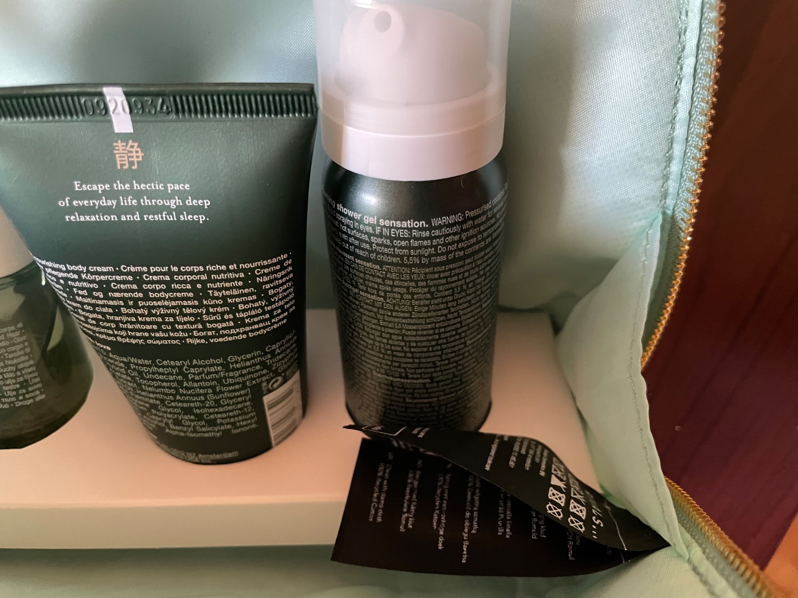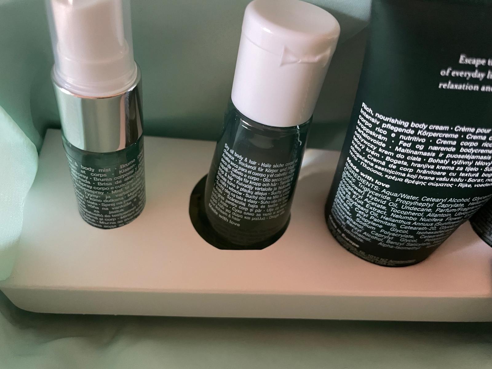 sprchová pena 50 ml, telový krém 70 ml, suchý olej na telo a vlasy 50 ml, sprej na vankúš a telo 20 ml