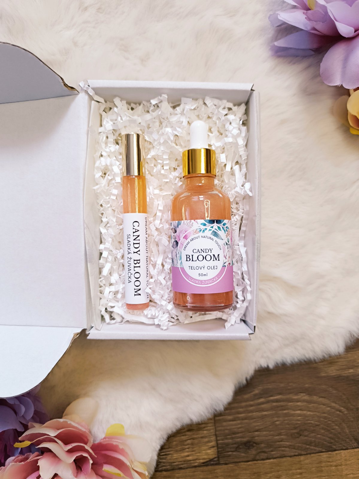 Veselý darčekový box telového oleja Candy Bloom, ideálny pre milovníčky sladkých a hravých vôní.