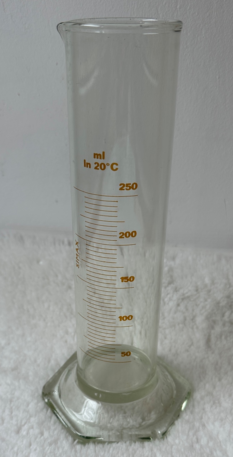 ❤️☘️Predám kvalitný sklenený odmerný valec SIMAX, objem 250 ml, ciachované na 20 °C. Silné laboratórne sklo, stabilná ťažká základňa, čitateľné stupnice. Vo veľmi dobrom stave, bez prasklín❤️☘️