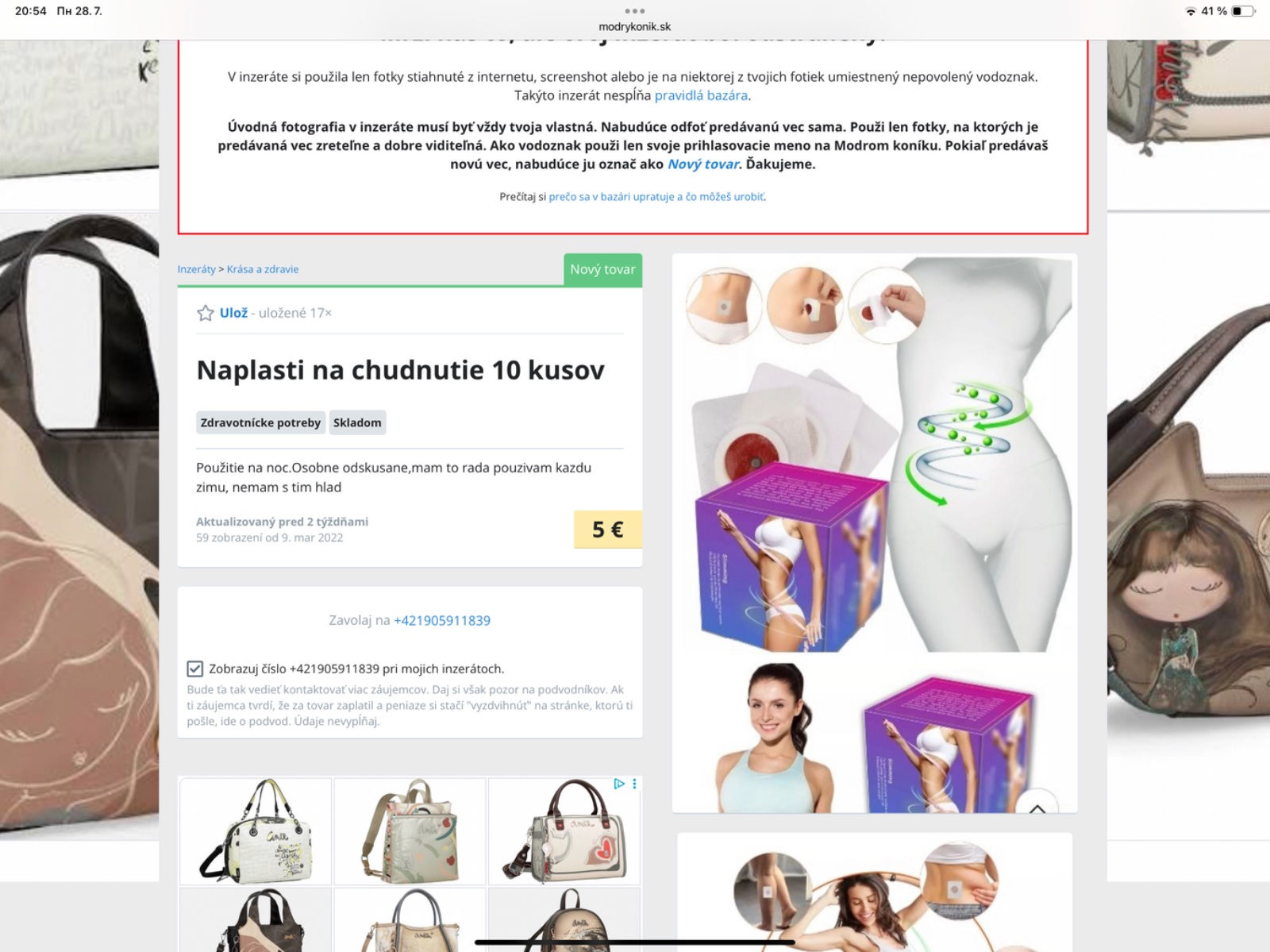 ZLACNOVALA SOM VECI POZRITE SI MOJ ALBUM....NEVYMIEŇAM...Čítajte poriadne podmienky predaja!!!.Som rada že ste nazreli do môjho albumu a že Vás zaujali moje vecičky. Rada premeriam veci a odpoviem na Vaše otázky. Vecičky späť neberiem!!! , radšej sa opýtajte viac krát. Na tovar, ktorý predávam sa nevzťahujú bežné podmienky reklamácie, takže pokiaľ sa Vám niečo roztrhne alebo pokazí po pár mesiacoch nosenia, žiaľ ja za to zodpovednosť nenesiem a nevraciam peniažky .Som ochotná rezervovať vecičky s môjho albumu vážnym záujemcom. Ceny ktoré uvádzam sú bez poštovného...balíčky posielam podla toho ako sa dohodnem s kupujúcim. Väčšinou posielam doporučene 2,triedou aj obyčajným poštovným ale na vlastné riziko - neručím stratením zásielky a ani nevratim peniaze za strateny balik!!!Posielam aj na dobierku ale naozaj vážnym a zodpovedným kupujúcim. Veci na dobierku neposielam neregistrovanym.Da sa dohodnúť aj na cene