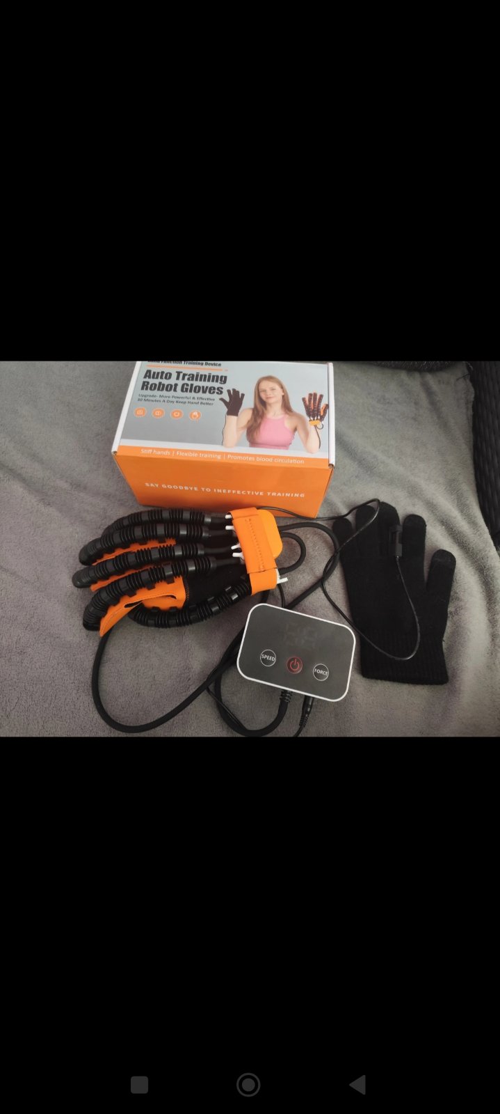 Len vyskúšané nesadla veľkosť dostali sme darom. Je bez známok používania jak nová v 100%stave na pravú ruku.Je vhodná pre pacientov po CMP alebo pre starších ľudí pri ochorení kĺbov na precvičovanie.Je napájania do elektrickej siete a môže si ju pacient ovládať aj sám keď si na druhú zdravú ruku navlecie druhú rukavicu tu čiernu a ovláda si pohyby sám.