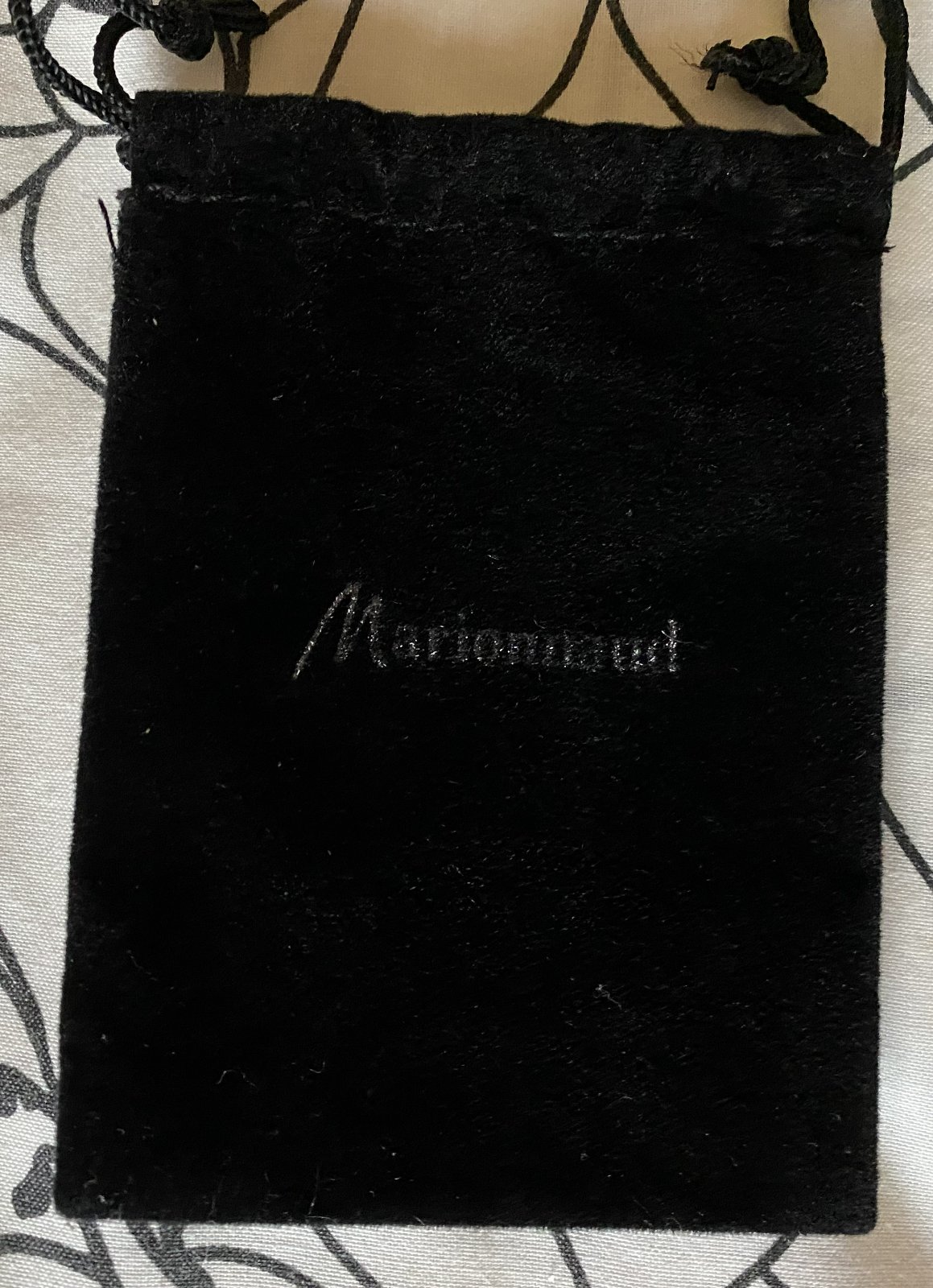 Sametová taštička marionnaud, sýta čierna farba, strieborný nápis, výška: 11cm, šírka: 8cm, vo veľmi dobrom stave, bez poškodenia.