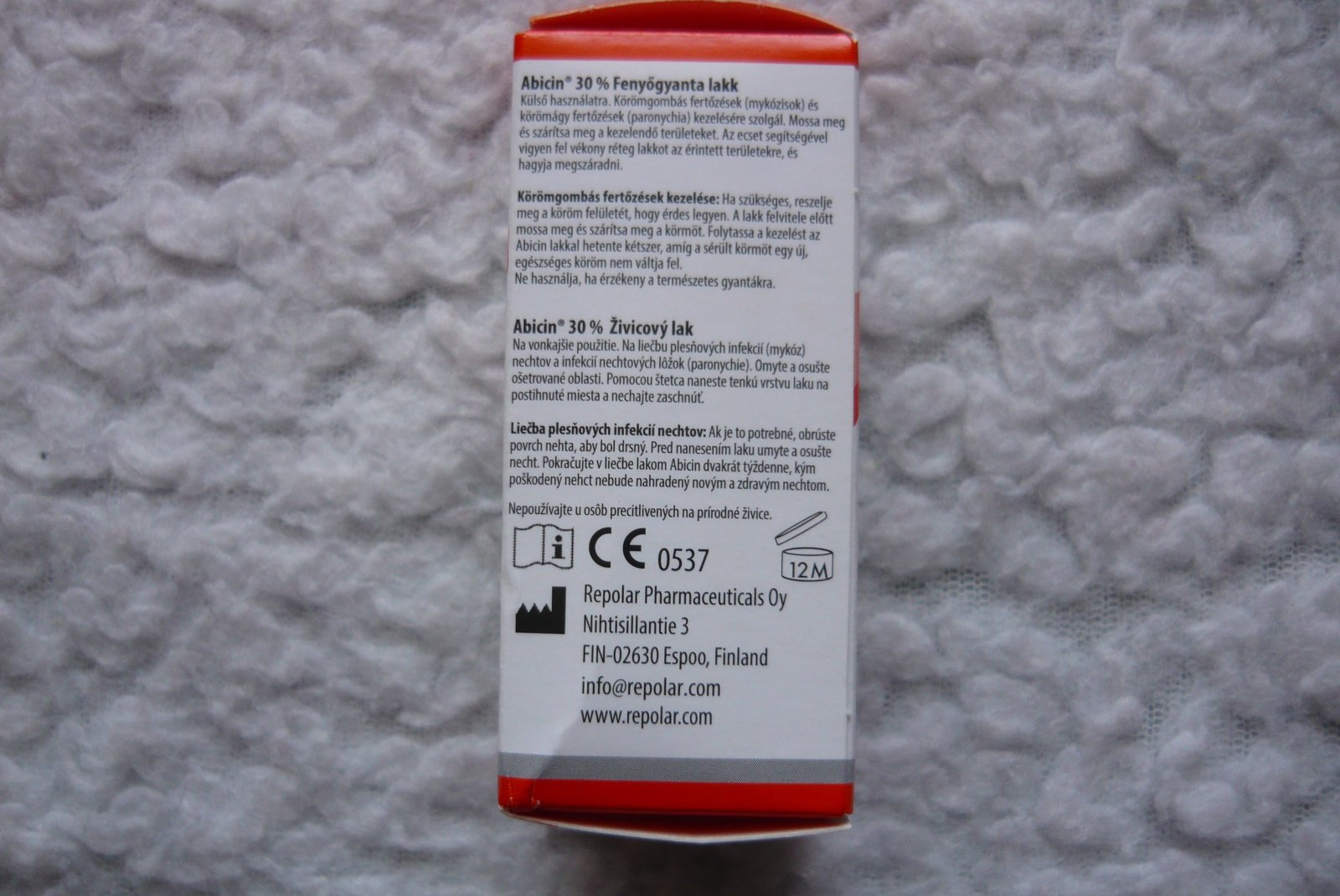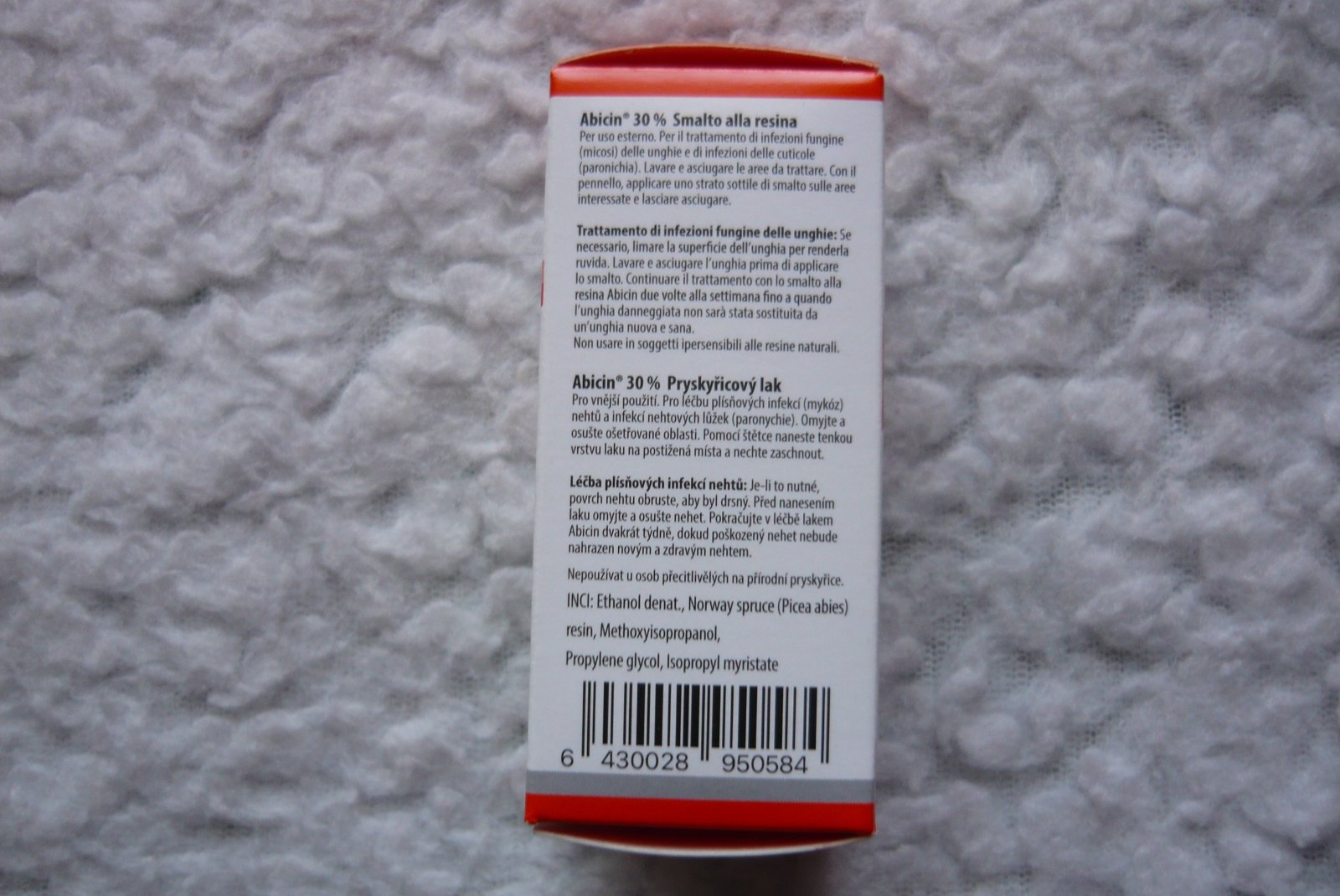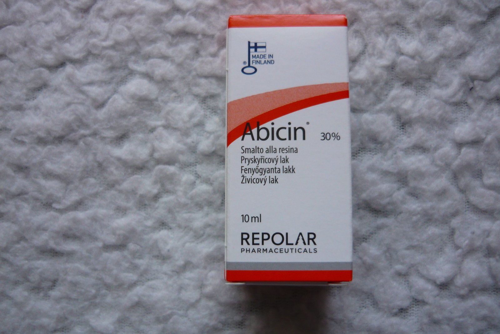 protiplesňový lak na nechty Abicin. Živicový lak na nechty určený na lokálnu liečbu miernych a stredne závažných plesňových infekcií nechtov a bakteriálnych infekcií nechtovej kožičky u dospelých. Jedná sa o zmes živice smreka ztepilého (Picea abies) a laku na nechty vyvinutého na lekárske použitie. Obsah živice v laku tvorí 30% zložiek. Surová živica z laku bola vyčistená pomocou patentovanej purifikačnej metódy. Každá šarža prípravku je testovaná, aby sa zaručilo správne zloženie a čistota.Cena 14 eur