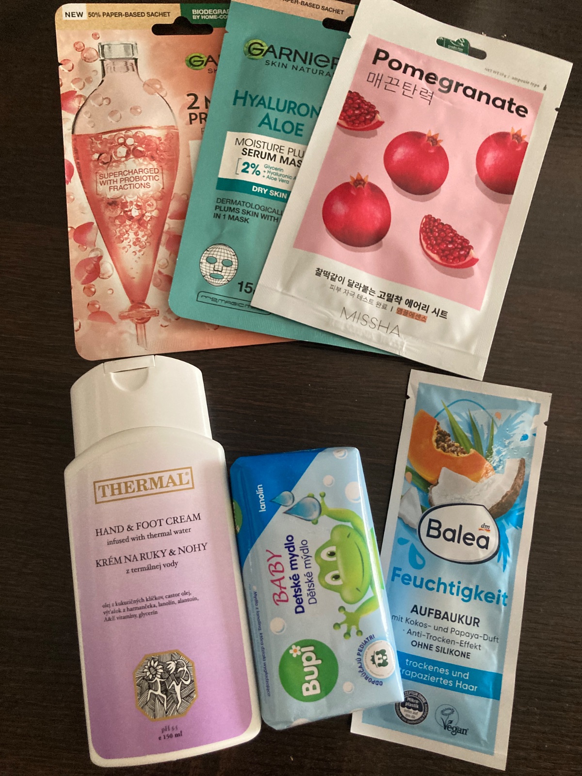 2x Garnier maska na tvár, 1x Missha pomegranate maska na tvár, 1x Balea kúra 25 ml na vlasy, Bupi detské tuhé mydlo, Thermal krém na ruky a nohy z liečivej vody