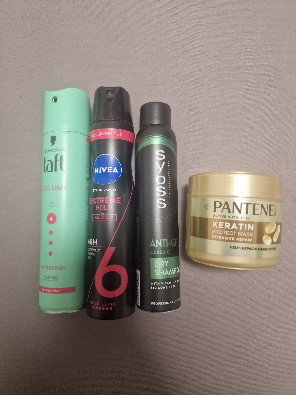 TAFT 4 + NIVEA 6 = lak na vlasy 250ml. Syoss = suchý šampón 200ml. Pantene = maska na vlasy. Cena 2,00eur za kus /Pantene 3,00 eur/, mám viac kusov.