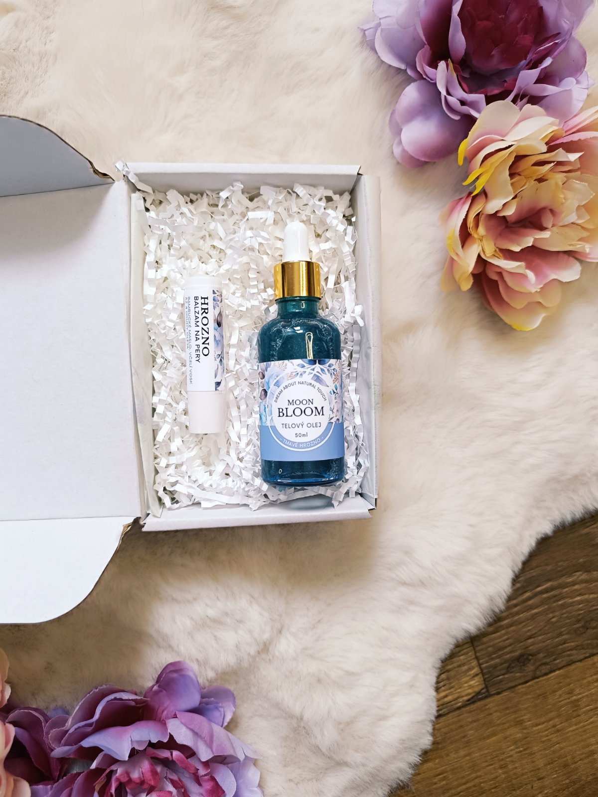 Elegantný darčekový box s telovým olejom Moon Bloom, s hlbokou a zmyselnou vôňou tmavého hrozna, ktorý dodá pokožke upravený vzhľad a jemný rozjasňujúci efekt. Ideálny ako darček alebo ako večerný rituál starostlivosti.