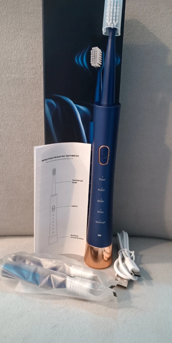 Sada obsahuje zubnú kefku, návod na použitie, 3 vymeniteľné hlavice a nabíjací USB kábel